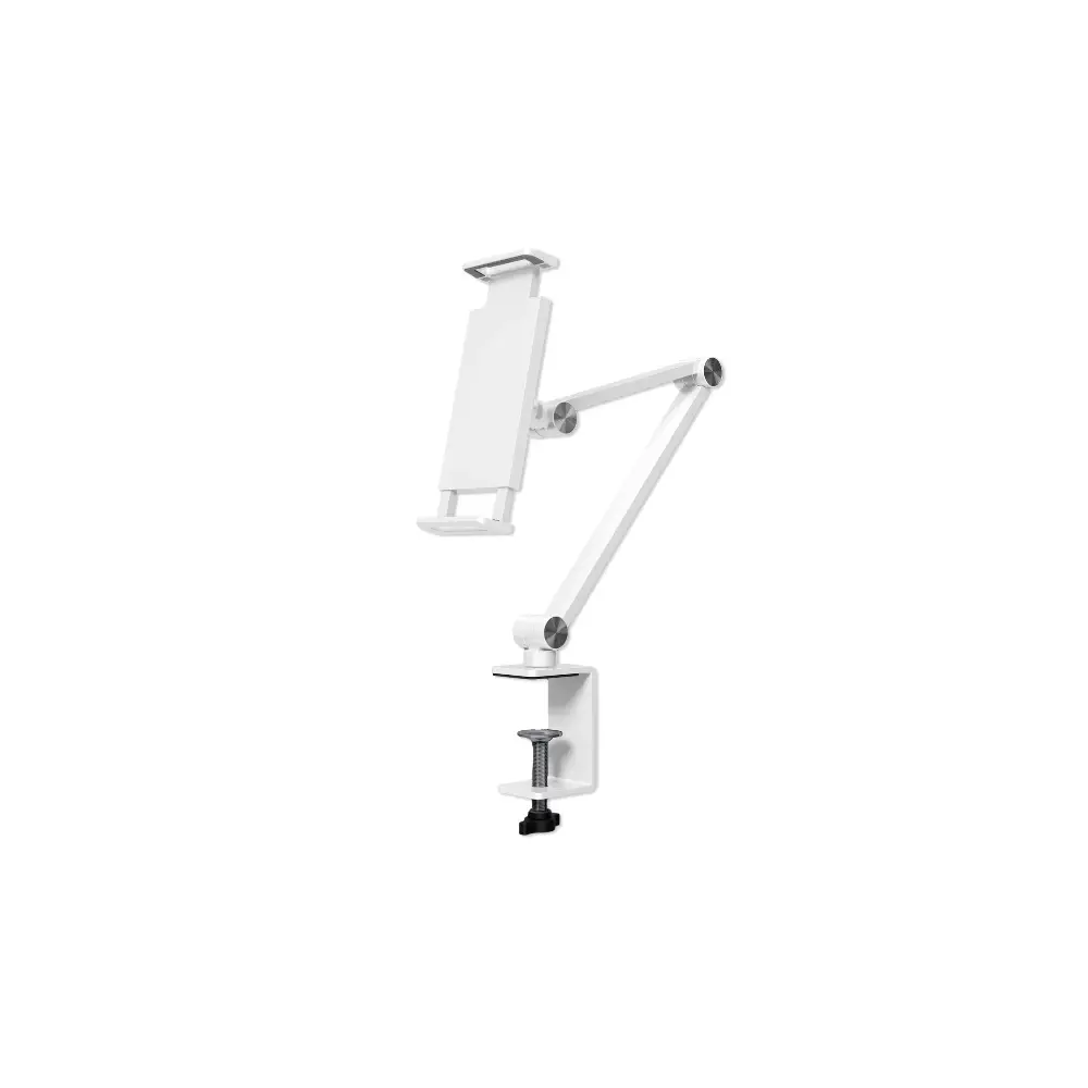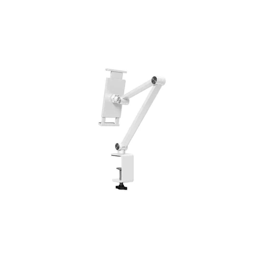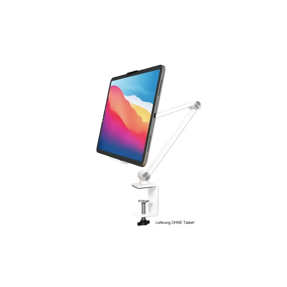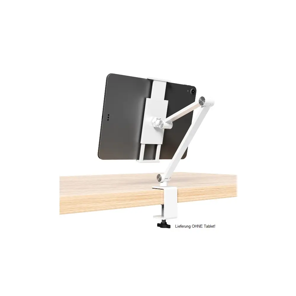 Hauptmerkmale • Stilvoll: Schickes Design aus hochwertigem Aluminium mit mattem Finish machen den ErgoFix zum Hingucker auf deinem Schreibtisch, in deiner Küche und überall sonst. • Praktisch: Klemme dein Gerät einfach zwischen die beiden Haltebacken oder nimm es wieder heraus. • Vielseitig: Der stabile Halterarm ist auf Wunsch verstellbar, neigbar, schwenkbar und 360° drehbar für eine optimale Positionierung. So kannst du Filme bequem im Querformat schauen oder Texte in der Hochformat-Position lesen. • Universal: Passend für nahezu alle gängigen Smartphones und Tablet-PCs von 4,7 - 15,6". • Variabel: Stufenlos verstellbare Krallen für die individuelle Anpassung und sichere Fixierung deines Gerätes. • Platzsparend: Wenn du ihn nicht verwendest, kannst du ihn in Windeseile abschrauben, zusammenklappen und platzsparend verstauen.Spezifikationen • Produktgröße: 400x170x170 mm • Für Geräte von 4,7" bis 15,6" • Drehbar 360° • Schwenkbar 180° • Neigbar 120° • Klemmengröße vom 125 mm bis 255 mmLieferumfang 1x Tisch-Halterung ErgoFix H9 weiß für Smartphones und Tablets 1x Sechskant-Schlüssel 1x Montageanleitung