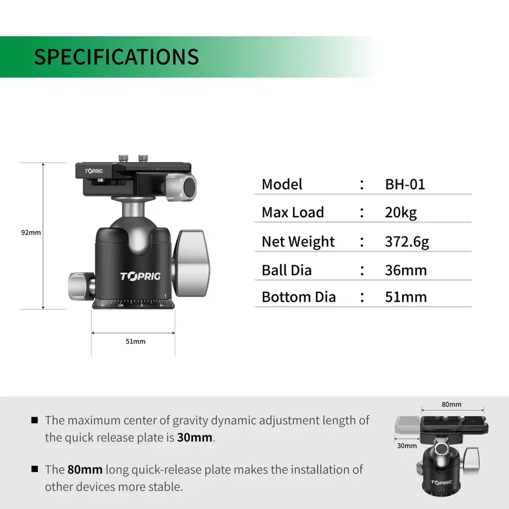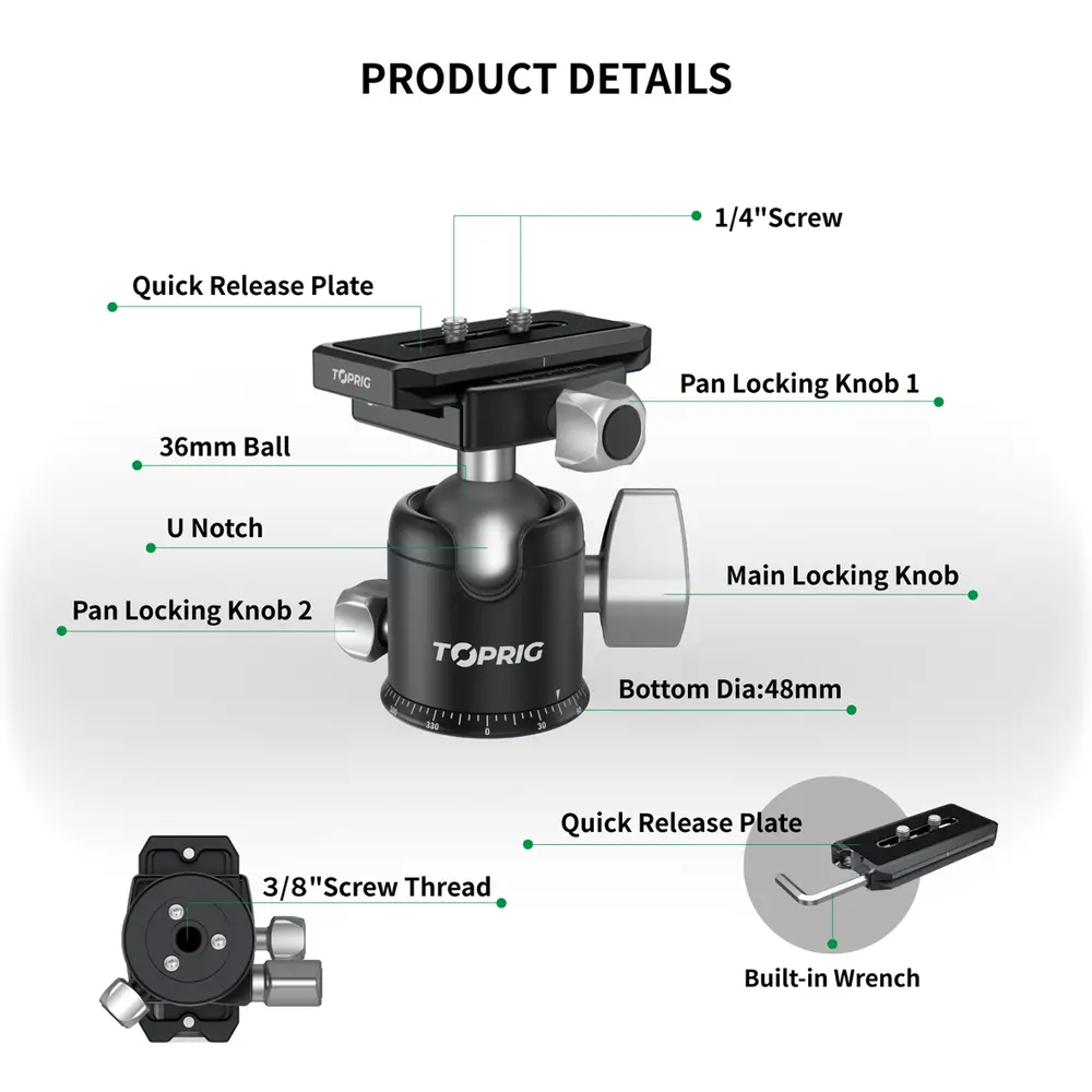 • Maximale Belastung 20 kg• Nettogewicht 372,6g• Kugel-Durchmesser 36mm• Boden-Durchmesser 51mm• Panoramakugelkopf 360°