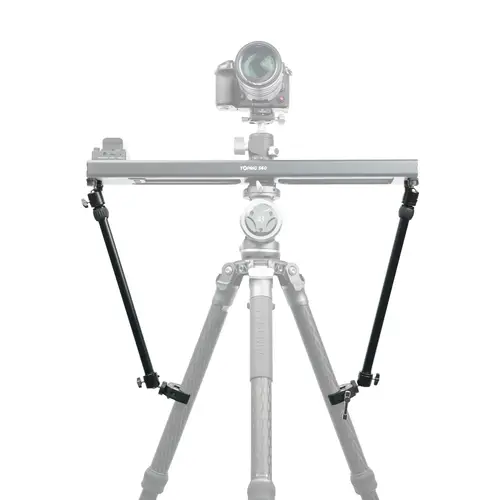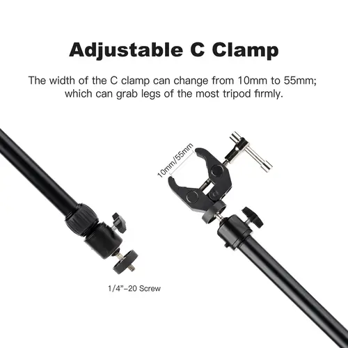 Verstellbare C-KlemmeDie Breite der C-Klemme kann von 10 mm bis 55 mm verstellt werden; damit können die Beine der meisten Stative fest gegriffen werden.