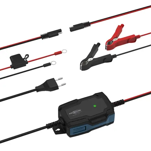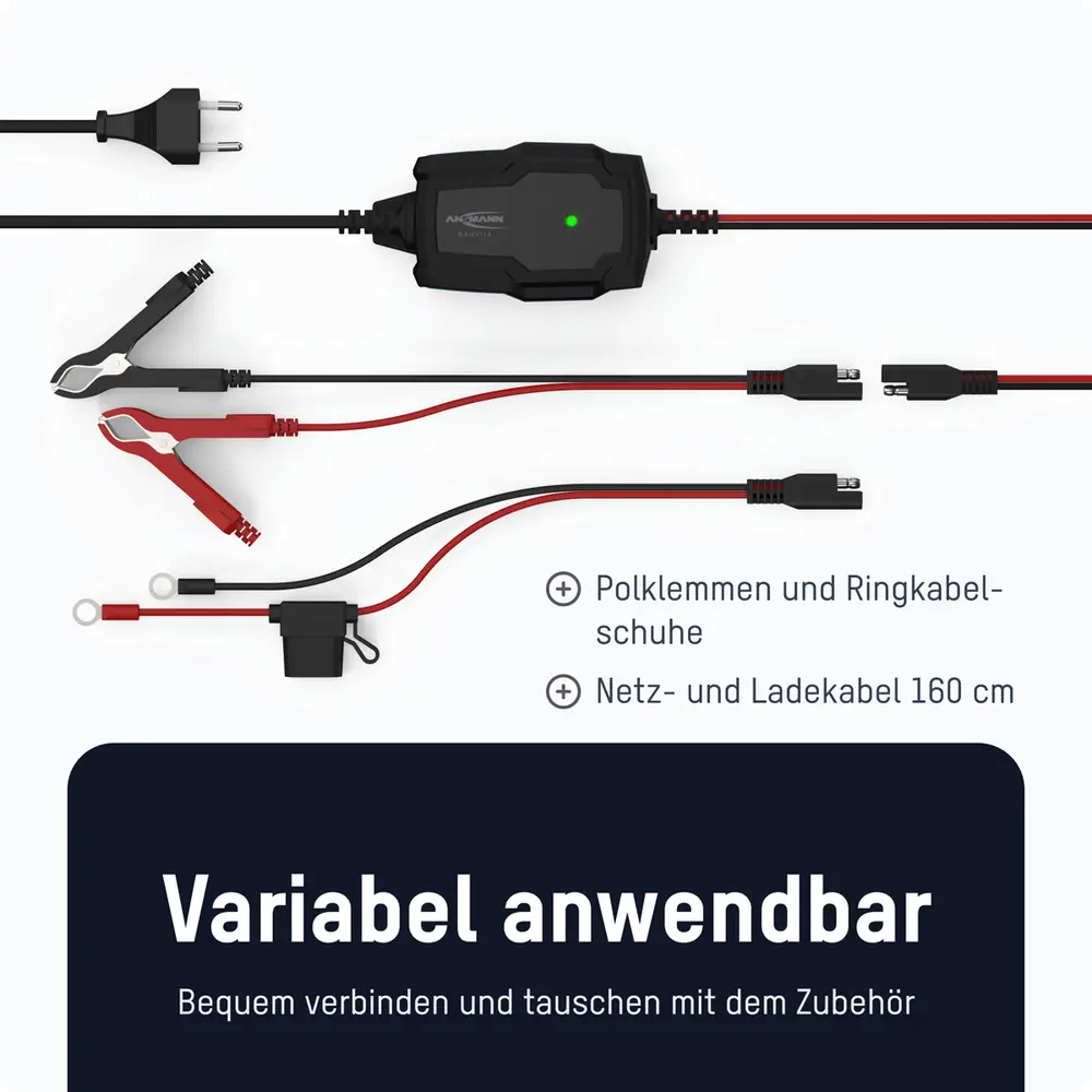Lieferumfang: Ladegerät, Polklemmen, Ringkabelschuhe, Bedienungsanleitung