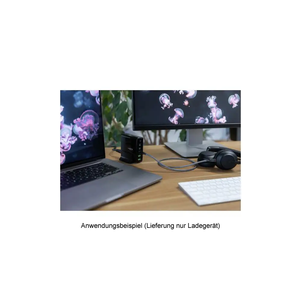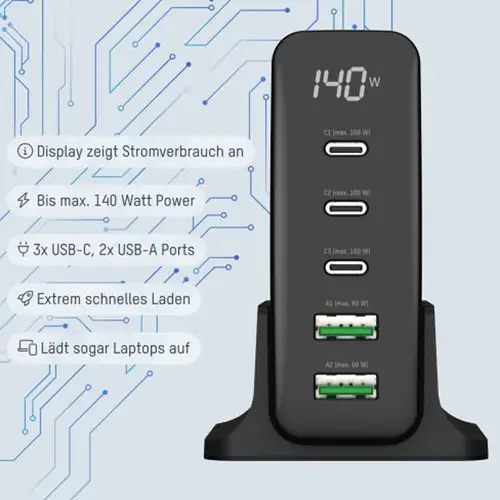 Laptops können an den USB-C Ports mit max. 140 Watt betrieben werden. Den beiden USB-A Ports steht jeweils eine Schnellladeleistung von 60W für weitere Anwendungen zur Verfügung!