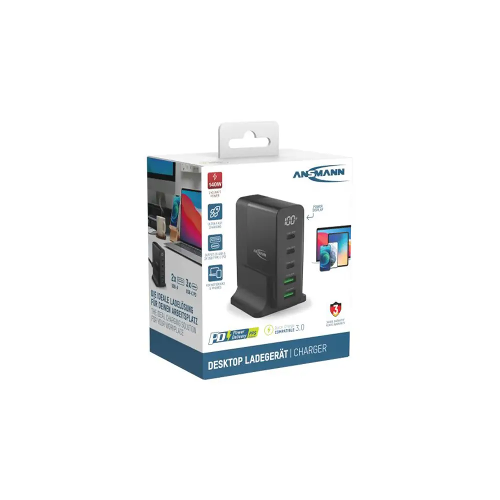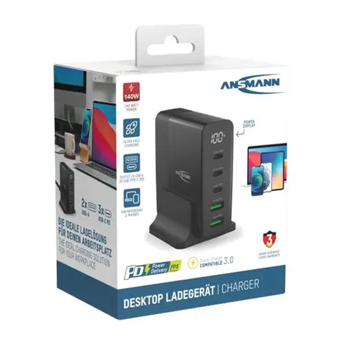 Das Desktop-Ladegerät von ANSMANN mit 5 USB-Ports und einer Leistung von 140 W bietet die ideale Ladelösung für Arbeitsplatz im Büro oder Homeoffice. Trotz des flachen Designs besticht das USB-Netzteil mit exzellenter Leistung.
