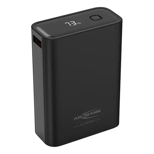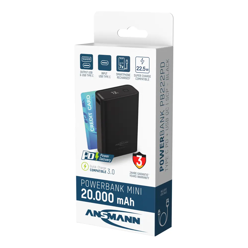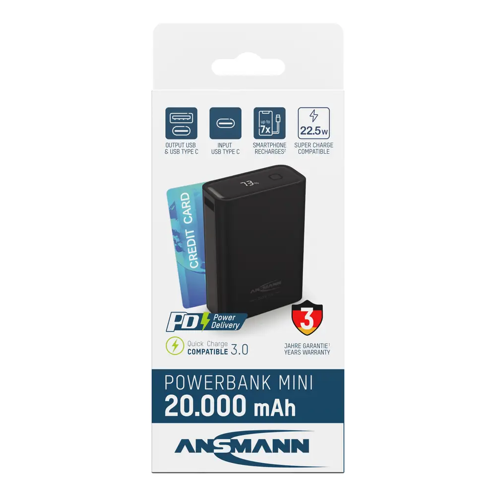 Die ANSMANN Powerbank unterstützt am USB-A Port das Huawei Supercharge Protokoll mit max. 22.5 Watt und ist auch Quickcharge 3.0 kompatibel. Der Typ-C Port unterstützt über das Power Delivery Protokoll Ladegschwindigkeiten bis zu 20 Watt und PD-PPS mit bis zu 22 Watt.