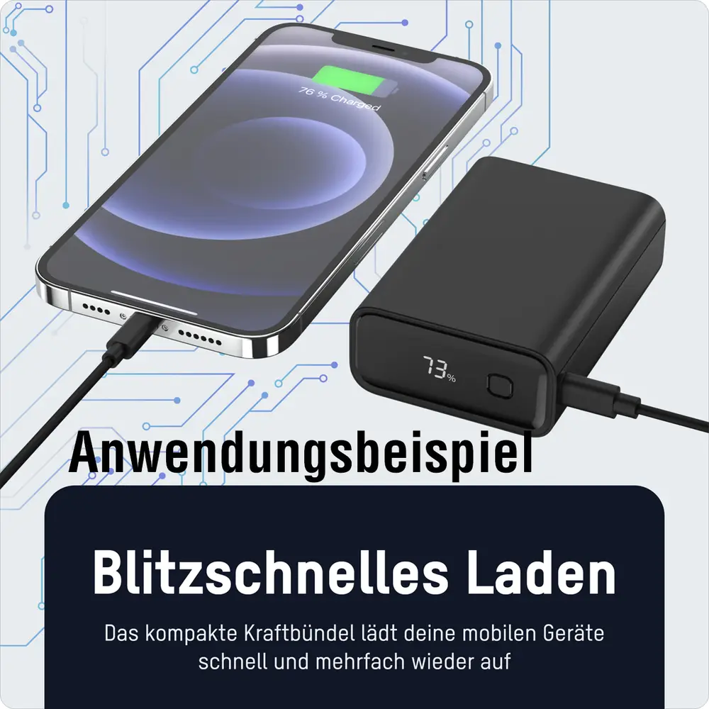 Lieferumfang: Powerbank, USB-C Kabel, Bedienungsanleitung