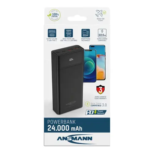Mit einer Ladekapazität von 24000 mAh und einer Ausgangsleistung von maximal 4,5 A lädt das Kraftpaket mobile Geräte mehrfach wieder auf. Der hochwertige Zusatz-Akku im stabilen Gehäuse ist kompatibel für alle gängigen USB-Geräte wie Smartphones, Tablets, Mobiltelefone, MP3-Player, Navigationsgeräte und viele weitere Anwendungen, die über USB aufgeladen werden können. Der USB-A Port ist schnellladefähig und kompatibel mit QuickCharge 3.0 sowie Huawei SuperCharge mit max. 22,5W. Dank des Power Delivery (PD) Protokolls ist mit dem Typ-C Anschluss nun auch das Laden von kompatiblen Notebooks möglich.