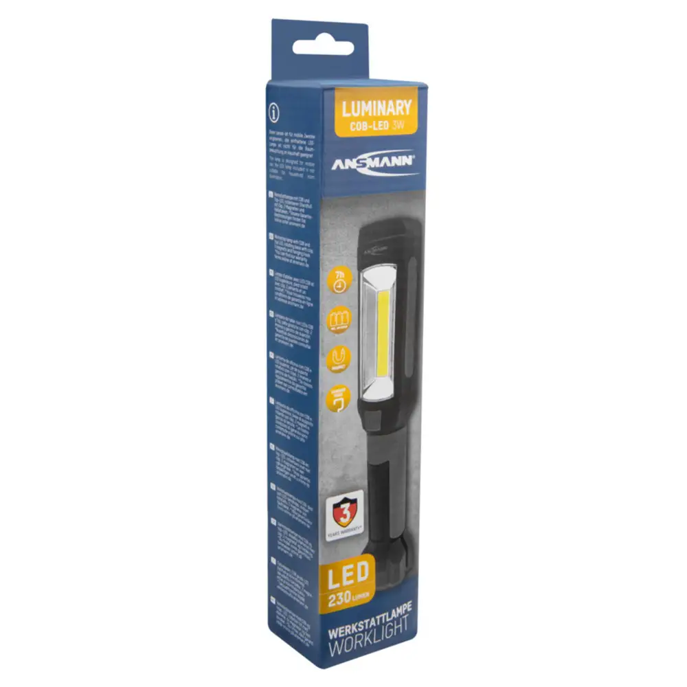 Die ANSMANN WL230B ist eine universell einsetzbare Werkstattleuchte mit neuester COB-LED Technologie und kleiner Zusatzleuchte am Lampenkopf. Die handliche und zuverlässige Leuchte integriert sich mühelos in den anspruchsvollen Alltag für Arbeiten an der Hebebühne, Inspektionen, in Werkstätten, Industrie, Haus, Hof oder Garage. Durch die robuste Bauart in Verbindung mit einem Haltehaken auf der Rückseite und 2 integrierten Haltemagneten am Fuß ist die Werkstattleuchte bestens für den Einsatz gerüstet und kann aufgrund des drehbaren Lampenkörpers sowie des Clips am Fuß in jeglicher Situation eingesetzt werden.