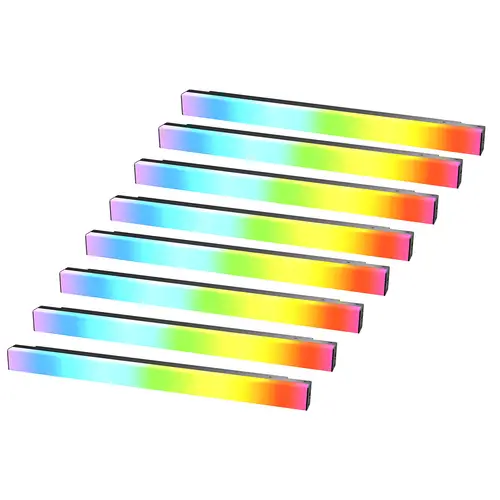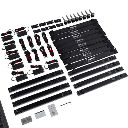Die INFINIBAR PB6 8-Light Kit enthält acht dieser Aputure-Pixelleisten mit jeweils 60 cm Länge und 48 individuellen RGB-Pixel-Lichtzonen. Zu deren Besonderheiten gehört die Möglichkeit, mehrere INFINIBARs variabler Längen über unterschiedlich geformte Verbindungsstücke* zusammenzuschließen und so kreative Formen und Effekte zu erschaffen. Die Lücken dieser Verbindungen werden durch das integrierte, stufenloses Blending Design optisch weitgehend eliminiert. Die 48 RGB-Pixel-Lichtzonen bieten damit nahtlose Pixel-Effekte.