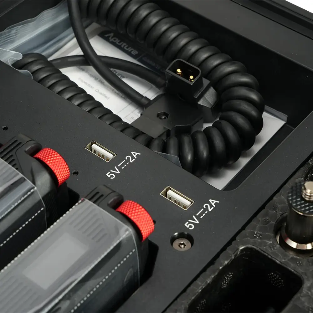 Filmemacher, die ständig unterwegs sind und V-Mount- oder Gold-Mount-Batterien verwenden möchten, können das MC Pro 8-Light Kit auch mit einem D-Tap-Akku über das mitgelieferte D-Tap-auf-D-Tap-Kabel mit Strom versorgen.