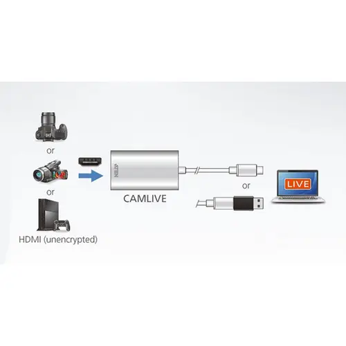 CAMLIVE ist Plug & Play-fähig. Die integrierte Unterstützung des UVC- und UAC-Standards ermöglicht den Systembetrieb ohne Installation von Treibern und liefert gleichzeitig atemberaubende, hochwertige Videos auf Windows und Mac Systemen mit 1080/60 fps. Durch das Senden von aufgenommenen RAW-Daten können Sie Videobearbeitung oder Live-Streaming mit verschiedenen gängigen Videobearbeitungsprogrammen/Plattformen von Drittanbietern genießen - Open Broadcaster Software (OBS), Xsplit, Twitch, YouTube, Facebook, um nur einige zu nennen.CAMLIVE bietet Ihnen mit seinem schlanken und ästhetischen Design ein angenehmes, hochwertiges Live-Streaming/Videobearbeitung mit Stil, egal ob bei der Arbeit oder unterwegs.Hauptmerkmale• Nimmt unverschlüsselte HDMI-Videosignale von Camcordern oder DSLR bis zu 1080p bei 60Hz auf (CAMLIVE kann keine HDCP-geschützten Inhalte anzeigen oder aufnehmen)• Unterstützt Live-Video-Streaming, Webcasting und Videokonferenzen• Kompatibel mit gängiger Streaming Software wie OBS, Xsplit, YouTube, Facebook und Twitch• Plug & Play – Unterstützt UVC/UAC v1.1• Kompatibel mit dem USB 3.1 Gen1 Typ-C Standard• Funktioniert mit allen gängigen Betriebssystemen: Windows und OS X Lieferumfang1x UC3020 CAMLIVE HDMI auf USB-C UVC Videoaufnahme1x USB-C auf USB-A Adapter1x BenutzeranleitungHinweis: Wenn Sie bei der Verwendung des USB-C auf USB-A Adapters nur MJPG-Video erkennen, trennen Sie bitte den USB-C Stecker vom Adapter, drehen Sie den USB-C Stecker um und verbinden Sie ihn wieder mit dem Adapter.