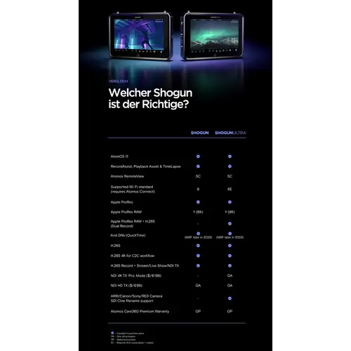 Der Shogun Ultra bietet alles, was Sie von einem Shogun erwarten: Er eignet sich perfekt für größere spiegellose HDMI- und SDI-Cinema-Kameras und verfügt über eine integrierte Netzwerkanbindung. Außerdem ist er das Tor zu erstaunlich schnellen und produktiven Cloud-Workflows. Der Shogun Ultra ist der beste Shogun den es je gab. Er eröffnet den Weg zu einer Vielzahl ultra-effizienter Cloud-Workflows, darunter Dual-Recording von ProRes RAW und H.265 für Camera to Cloud, den automatischen Abgleich von Dateinamen mit gängigen Cine-Kameras und 4K H.265 für die sofortige Publikation in der Cloud. Die enge Partnerschaft von Atomos mit führenden Kameraherstellern stellt sicher, dass Shogun Ultra mit einer ständig wachsenden Zahl von DSLR-, spiegellosen und Cine-Kameras zusammenarbeitet.