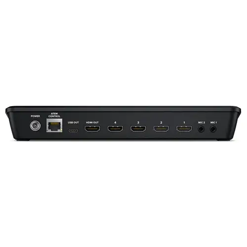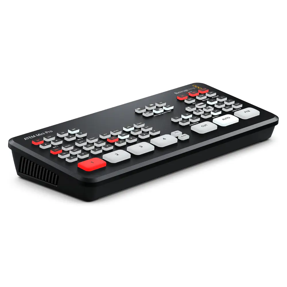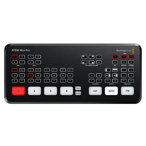 Der ATEM Mini Pro von Blackmagic Design ist fix eingerichtet und bedienfreundlich. Seine Features umfassen vier skalierbare HDMI-Eingänge, einen USB-Webcam-Ausgang, einen HDMI-Ausgang und einen Fairlight Audiomixer mit EQ und Dynamiktools, einen DVE-Prozessor für Bild-im-Bild-Darstellungen, Übergangseffekte, einen Greenscreen-Chromakeyer und einen 20 Standbilder fassenden Media Pool für Titel. Obendrein gibt es die ATEM Software Control kostenfrei dazu.