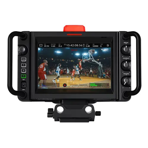 Bedienelemente: Touchscreen für Kameraeinstellungen und -menüs sowie Einstellrad, Programmtaste, belegbare Funktionstasten F1, F2 und F3, Drehregler für Helligkeit, Kontrast und Peaking