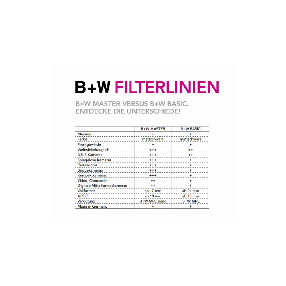 Die Fertigung aller B+W Filter erfolgt in Deutschland auf höchstem Niveau mit minimalen Toleranzen. Das Grundmaterial der Filterfassungen besteht aus Messing, ein Garant für hohe Stabilität und Langlebigkeit. Der spezielle Funktionslack erleichtert mit seinen optimierten Gleiteigenschaften das Ein- und Abschrauben des Filters. Darüber hinaus garantiert eine exakte Glasauflage einen planen und spannungsfreien Sitz des Filterglases. Die Filter eignen sich für alle Brennweiten, einschließlich (Super)Weitwinkel- bis Teleobjektiv.