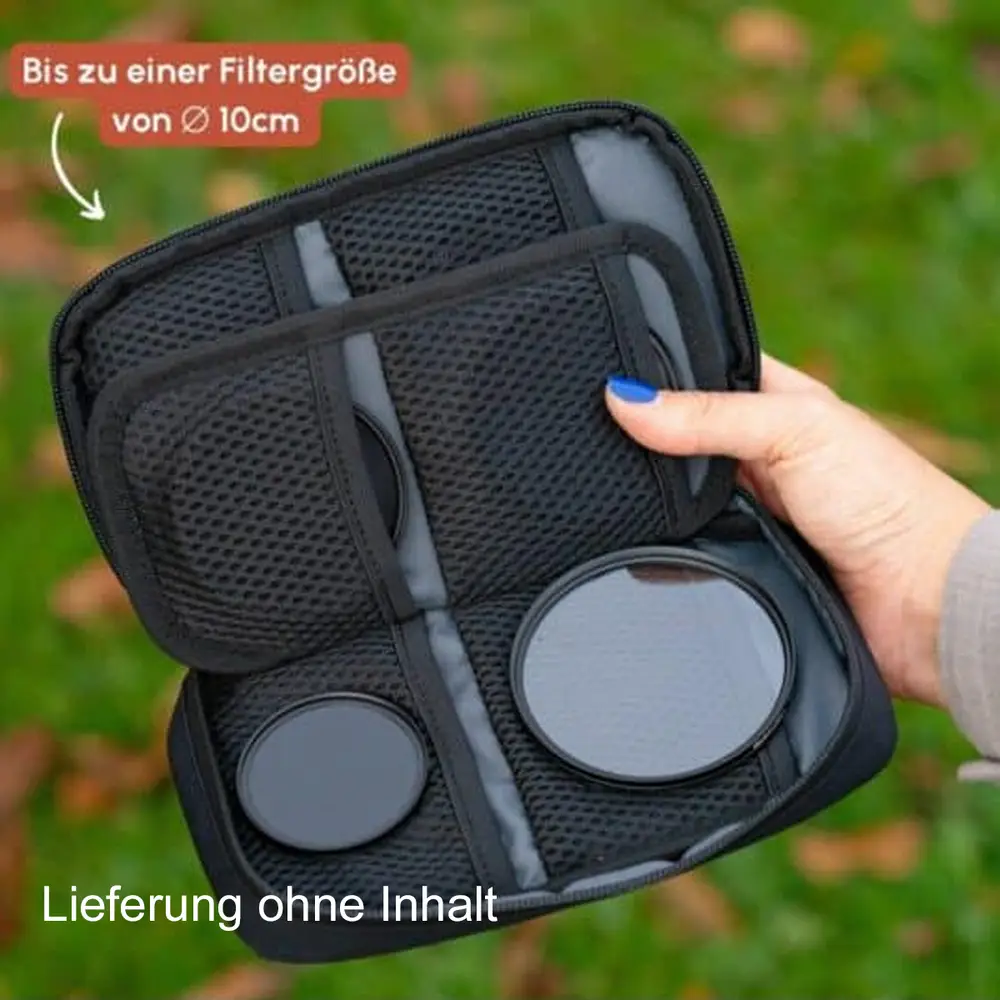 Ob Polfilter, UV-Filter, ND-Filter oder Graufilter – mit unserer Filtertasche bleiben alle Deine Kamerafilter sicher, sauber und griffbereit. Egal, ob Du in der Stadt unterwegs bist, Landschaften fotografierst oder Deine großen Filter einfach nur sicher transportieren willst – diese wasserabweisende Kameralinsenfiltertasche ist ein Must-have für alle Fotograf:innen.