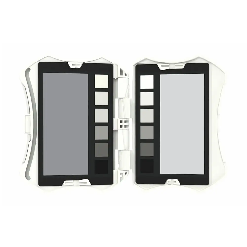 Enthält 4 austauschbare Karten mit einer umfangreichen Anzahl an Referenzfarben aufgeteilt in eine Primärfarbenkarte sowie eine Karte mit Pastell und Hauttönen. Darüber hinaus große Graukarten für die Belichtungsmessung sowie den Weiß- und Grauabgleich sowie einen 12-stufigen Graukeils für die präzise Einstellung des Kontrastumfangs.