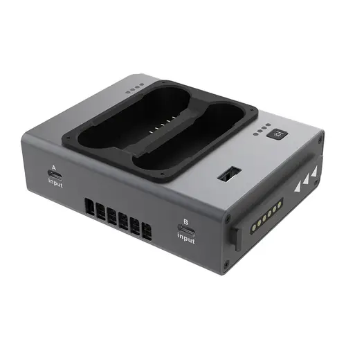 Das Gerät verfügt über zwei USB-C-Netzeingänge, die zusammen bis zu 100 W unterstützen. Dank des Daisy-Chain-Designs und einer sicheren Verriegelung können bis zu drei DQC2-Ladegeräte miteinander verbunden werden und so bis zu sechs Akkus gleichzeitig geladen werden.