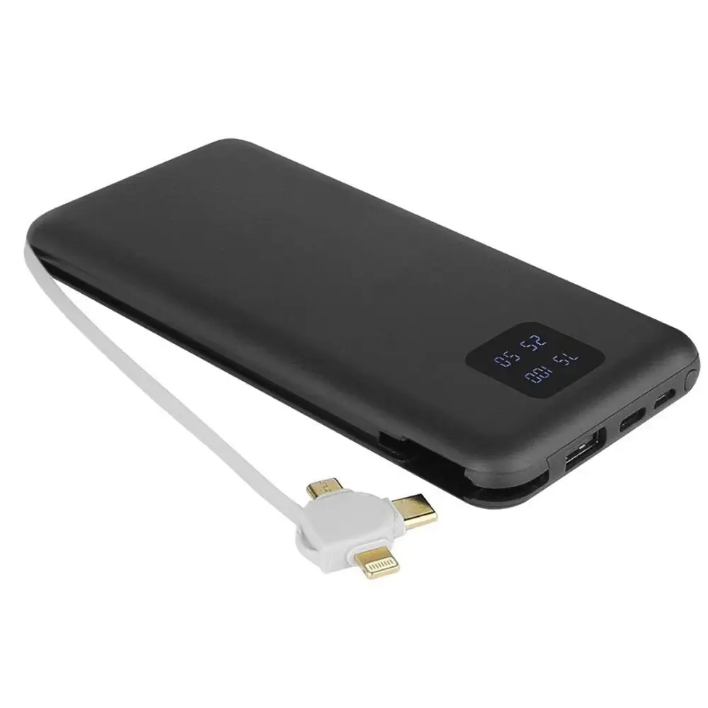 Mit der 10.000 mAh starken Powerbank „Kari 10“ ist man bestens zum Aufladen von Geräten mit verschieden Anschlüssen gerüstet. Das in das Gehäuse integrierte Kabel ist mit einem kombiniertem Micro USB/8-Pin/USB Type-C Stecker versehen. Der Stecker findet bei Nichtgebrauch Platz im Gehäuse der Powerbank. Aufgeladen wird die Powerbank über den Micro USB- oder den Type-C-Eingang. Der aktuelle Ladestand wird im LED-Display der Powerbank angezeigt. Mit einer Dicke von nur 19 mm passt sie in fast jede Tasche. Die kompakte Powerbank bietet höchste Sicherheit durch Überlade-, Überspannungs- und Kurzschluss Schutz. Technische Daten:Material Gehäuse: ABS + PCEingang: 5V DC 2A Ausgang: 5V DC 2A Akku: 10.000 mAh Li-PolymerIntegriertes Kabel mit Micro USB/8-Pin/Type-C Kombi-SteckerLadeanschluss: Micro USB / USB Type-C LED LadestandsanzeigeAbmessungen: 139 x 70 x 19 mmGewicht: 215g