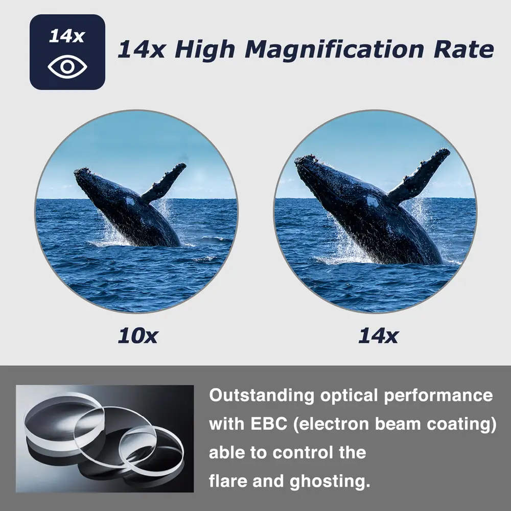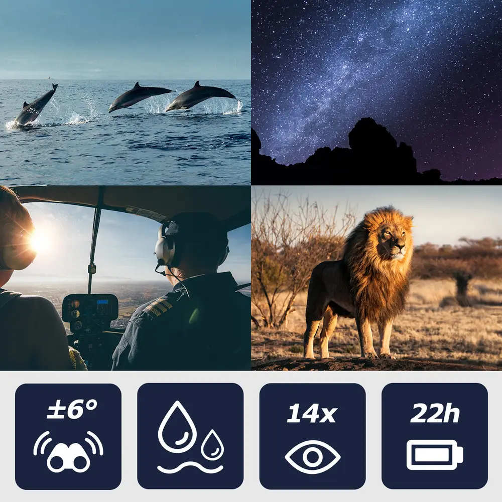 • Ermöglicht auch ohne Stativ eine stabile Sicht bei 14-facher Vergrößerung – ein klarer Vorteil gegenüber einem Fernglas ohne Bildstabilisierung.