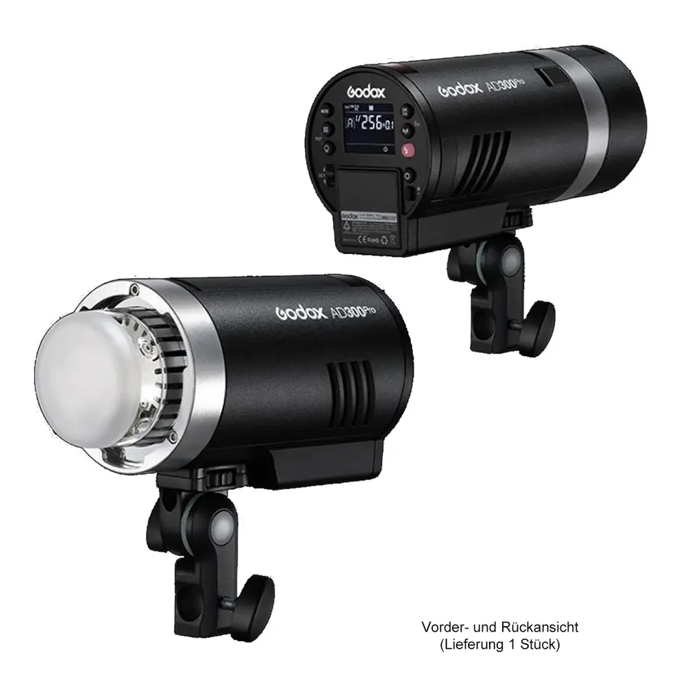 1x AD300 Pro: All-in-One Outdoor-Blitzgerät, Leistung 300 Ws, Betriebsarten TTL, Manuell, Stroboskop, HSS, Slave S1/S2, 1/220 bis 1/10200 s, integr. 2,4 GHz Wireless X-System, Dot-Matrix LCD