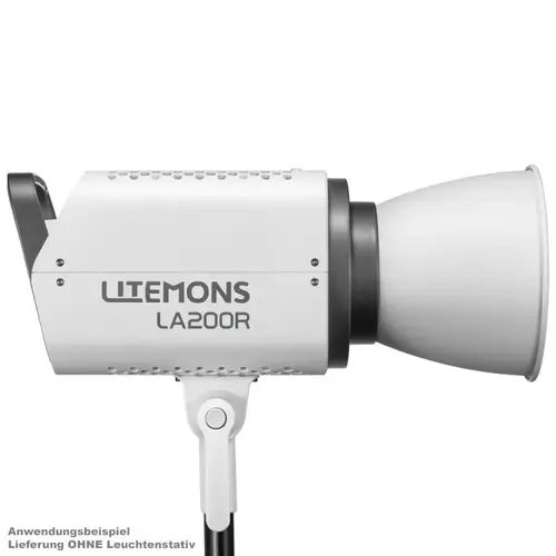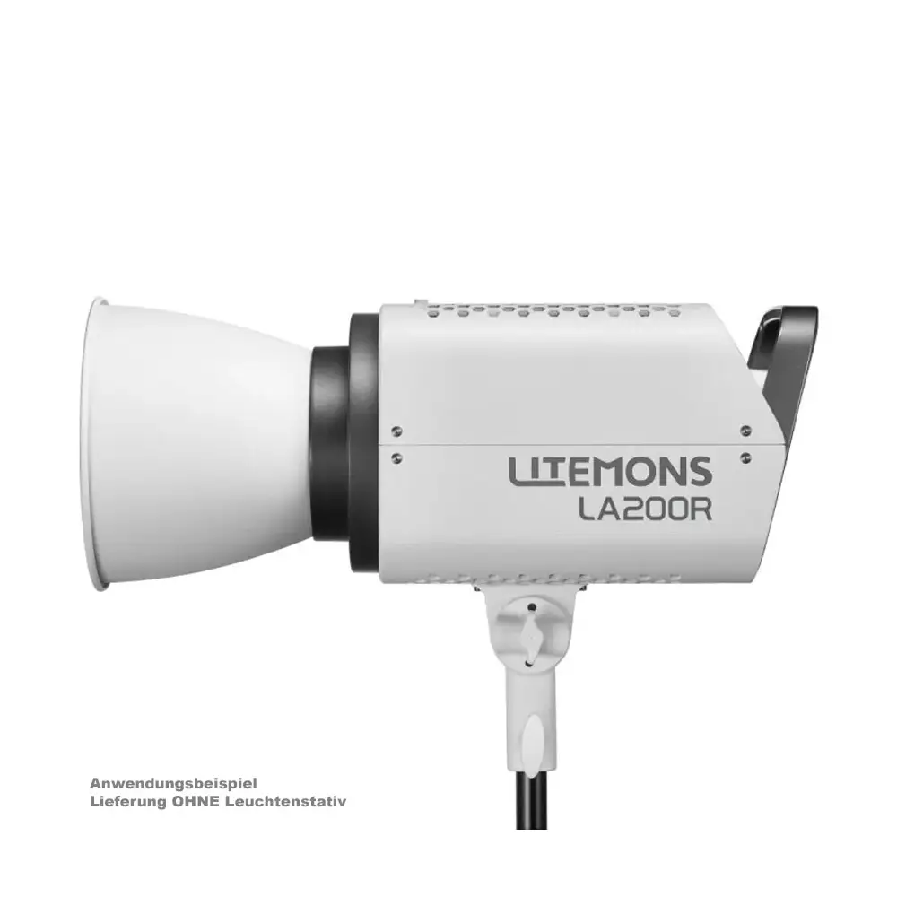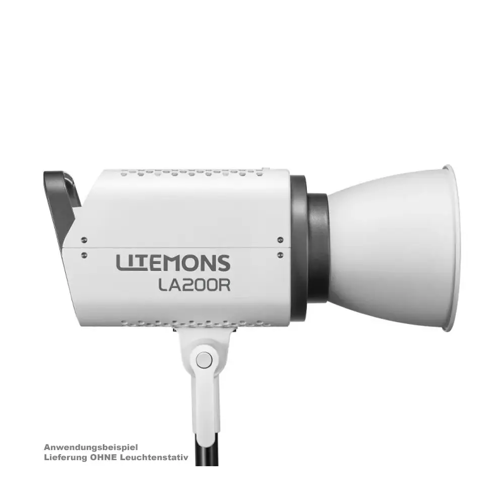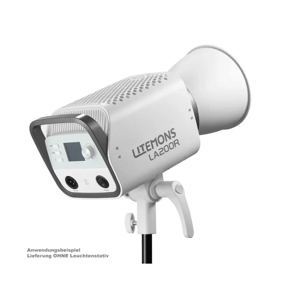 Das kompakte weiße Gehäuse enthält eine 220-Watt-Einheit, die leistungsstarkes Licht erzeugen kann. Die Leuchte verfügt über eine universelle Bowens-Halterung. Auf der Rückseite des Geräts befindet sich ein Bildschirm zur Überwachung der Parameter sowie Tasten und ein Drehregler für einfache Anpassungen. Die Litemons LA-Serie ist eine kompakte Beleuchtungslösung für alle Arten von Videoaufnahmen und Content-Erstellung.
