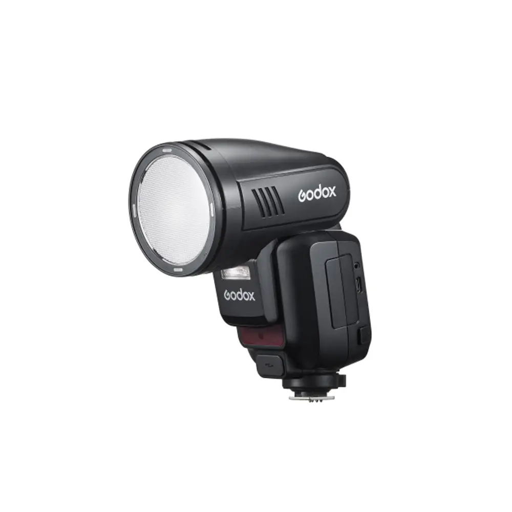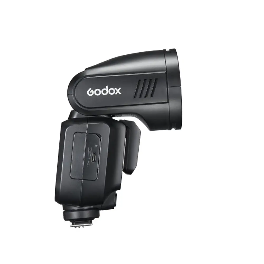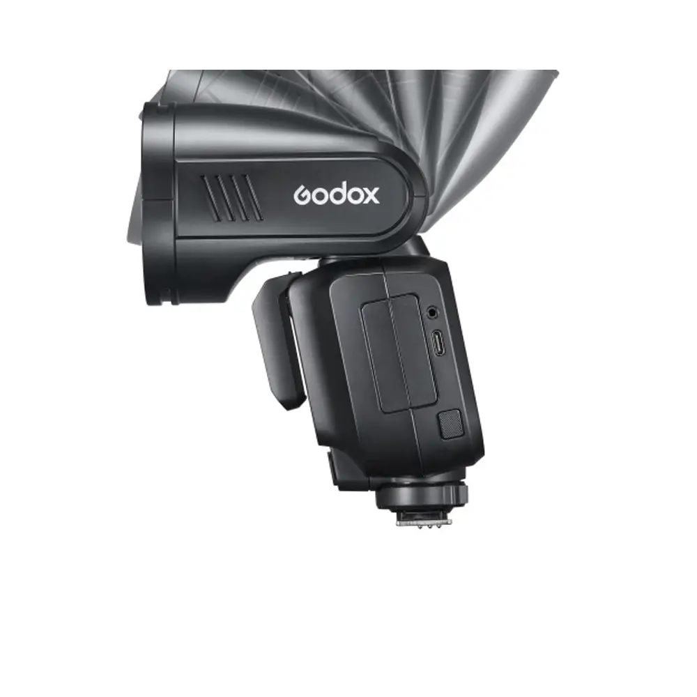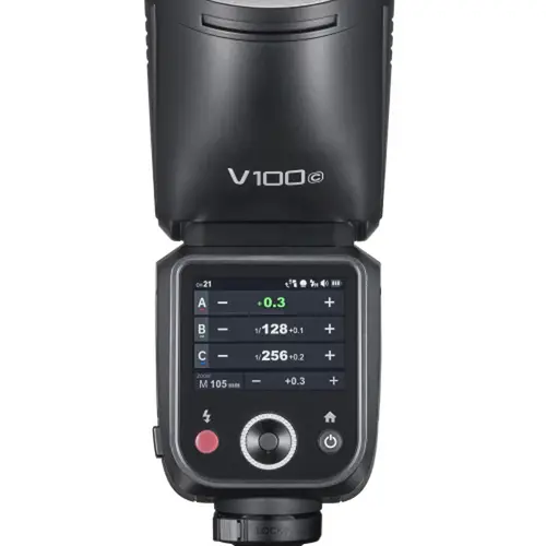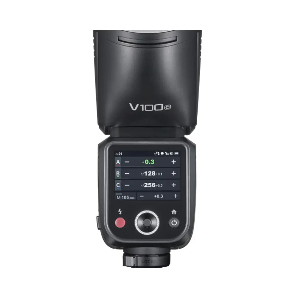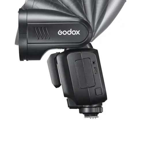 • Stromversorgung. Der V100 wird mit demselben Akku wie der V1 Pro betrieben und liefert bis zu 400 Blitze bei voller Leistung für eine lange Nutzungsdauer. Der USB-C-Anschluss bietet zusätzlichen Komfort beim Laden, und die Akkus können auch mit dem Godox VC26T Ladegerät (nicht im Lieferumfang enthalten) geladen werden. Außerdem verfügt der V100 über einen Anschluss für das PB960-Strommodul (nicht im Lieferumfang enthalten), der die Ladezeit auf nur 0,8 Sekunden reduziert.
