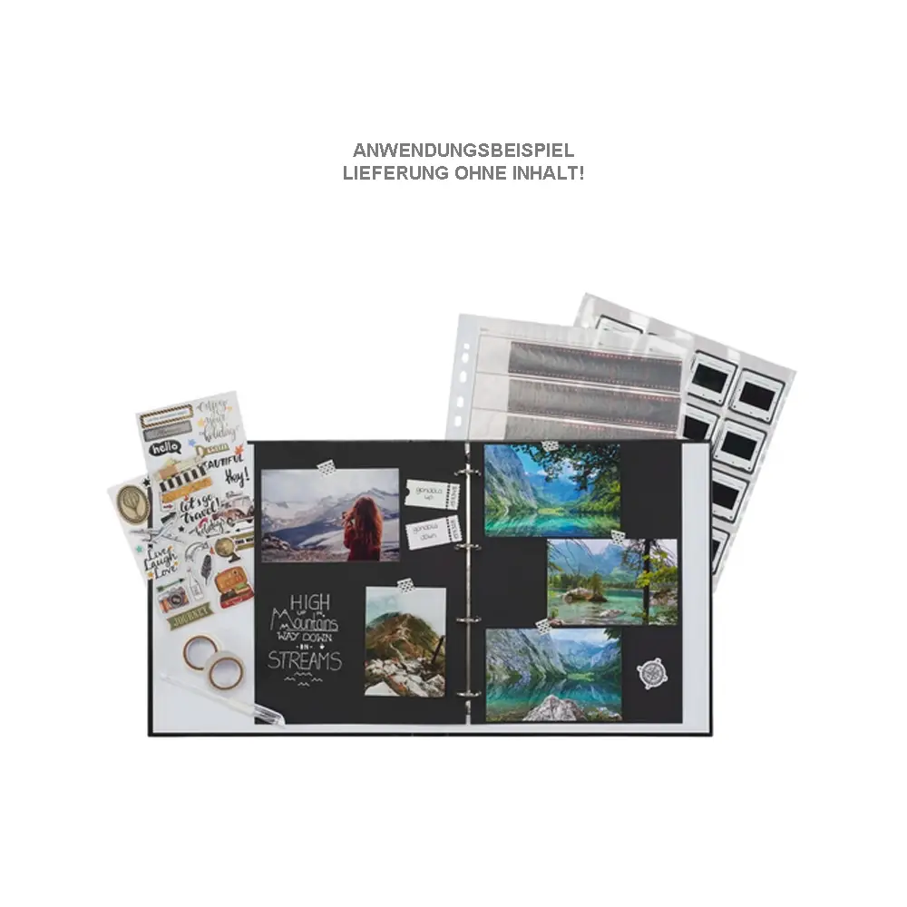 • Stabil und viel Platz: praktische Aufbewahrungsmöglichkeit für Fotografien, Negative oder Dias.• Sicher aufbewahren: zum Schutz vor äußeren Einflüssen wie Staub, Lichteinstrahlung, Feuchtigkeit.• Alles in bester Ordnung: Abheften von Schutzhüllen und Blättern über das Format DIN A4 hinaus bis zu einer Blattgröße von 31 cm x 26 cm.• 4-Ring-Kombimechanik erleichtert das Blättern und schnelle Archivieren.• Edle Oberflächenverarbeitung mit Leinenstruktur in Schwarz.• Aufdruck "Negative" für schnelles Auffinden im vollen Regal oder Schrank.• Abwischbare, laminierte Oberfläche.