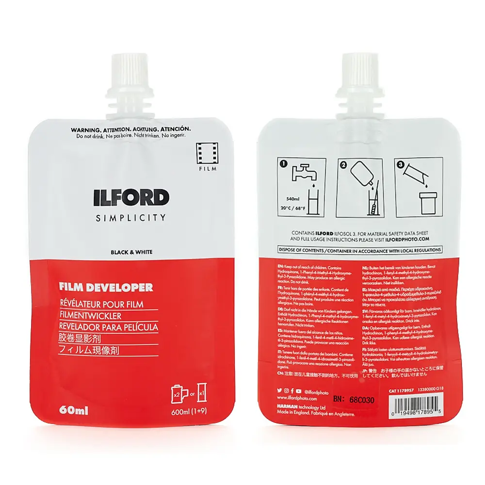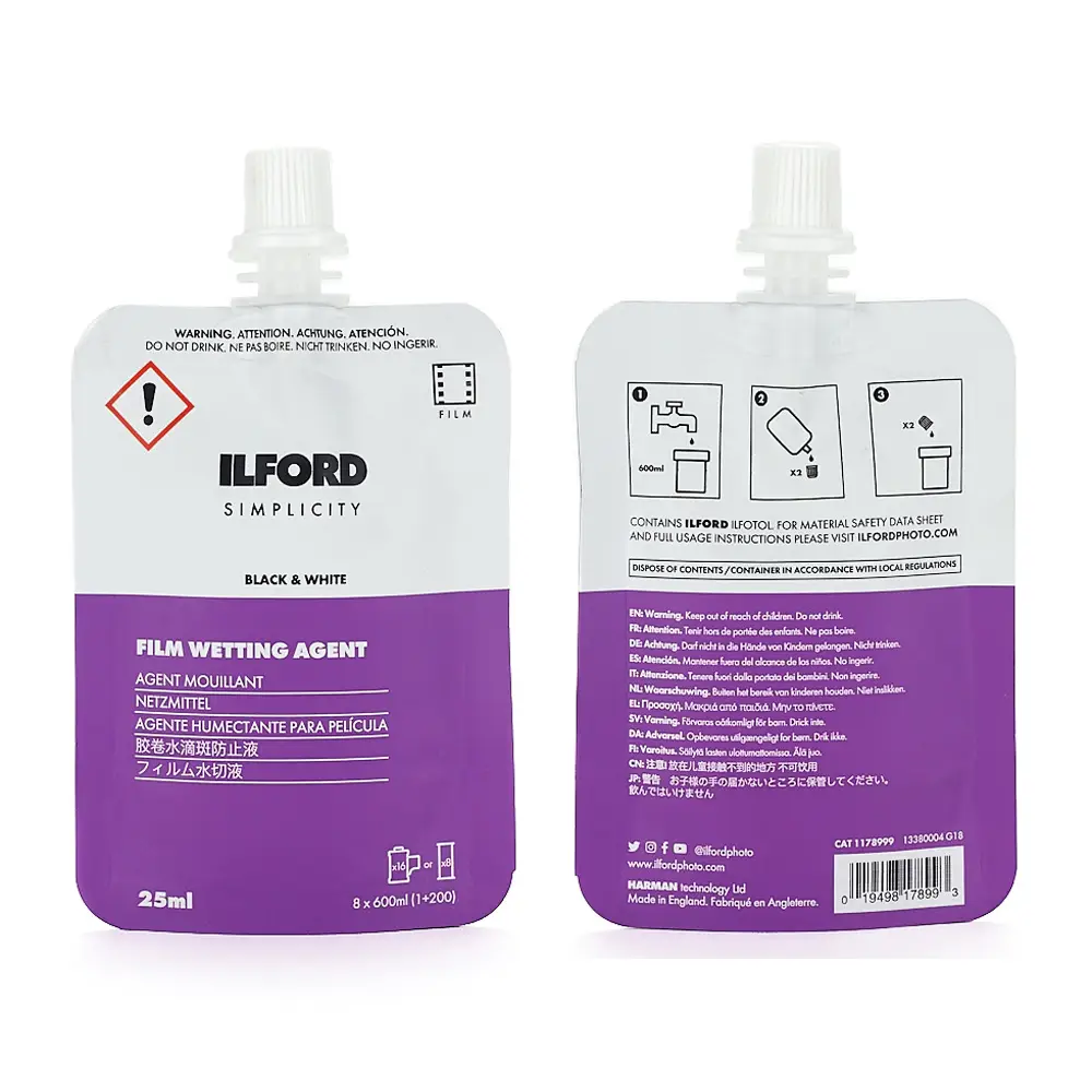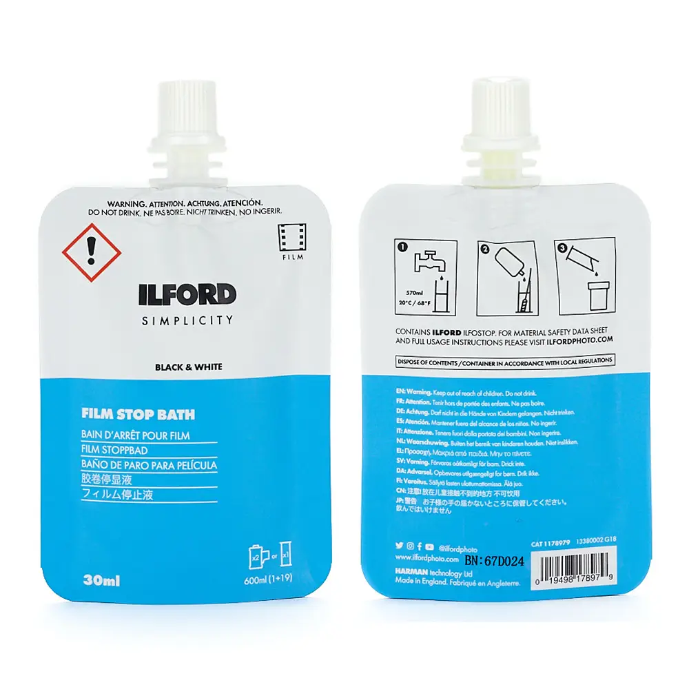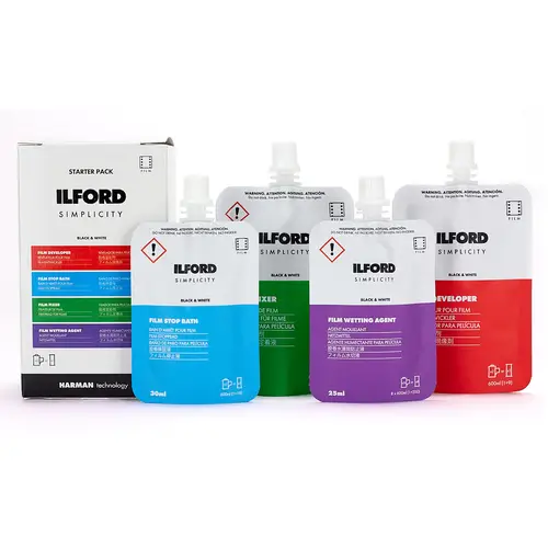 Diese Chemikalien werden als Teil des Standardentwicklungs-, Stopp-, Fixier- und Waschprozesses verwendet.Mischen Sie einfach den gesamten Inhalt* eines Beutels mit Wasser bei der richtigen Temperatur,um 600 ml Flüssigkeit herzustellen, und verwenden Sie sie im Entwicklungstank.* Bitte beachten Sie, dass der Beutel für das Netzmittel bis zu 8-mal verwendet werden kann, um 16x 35 mm oder 8 x 120 Filme zu entwickeln, wenn Sie ihn in einem 600 ml-Tank verwenden.FILM PROCESSING STARTER PACK enthält: 1 x Filmentwickler (Ilford Ilfosol 3)1 x Stoppbad1 x Fixiermittel (Ilford Rapid Fixer)1 x NetzmittelEin Starterpaket entwickelt 2 x 35 mm (135) Filme oder 1 x 120 Film in einem 600 ml-Tank.