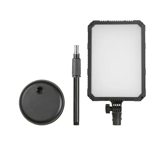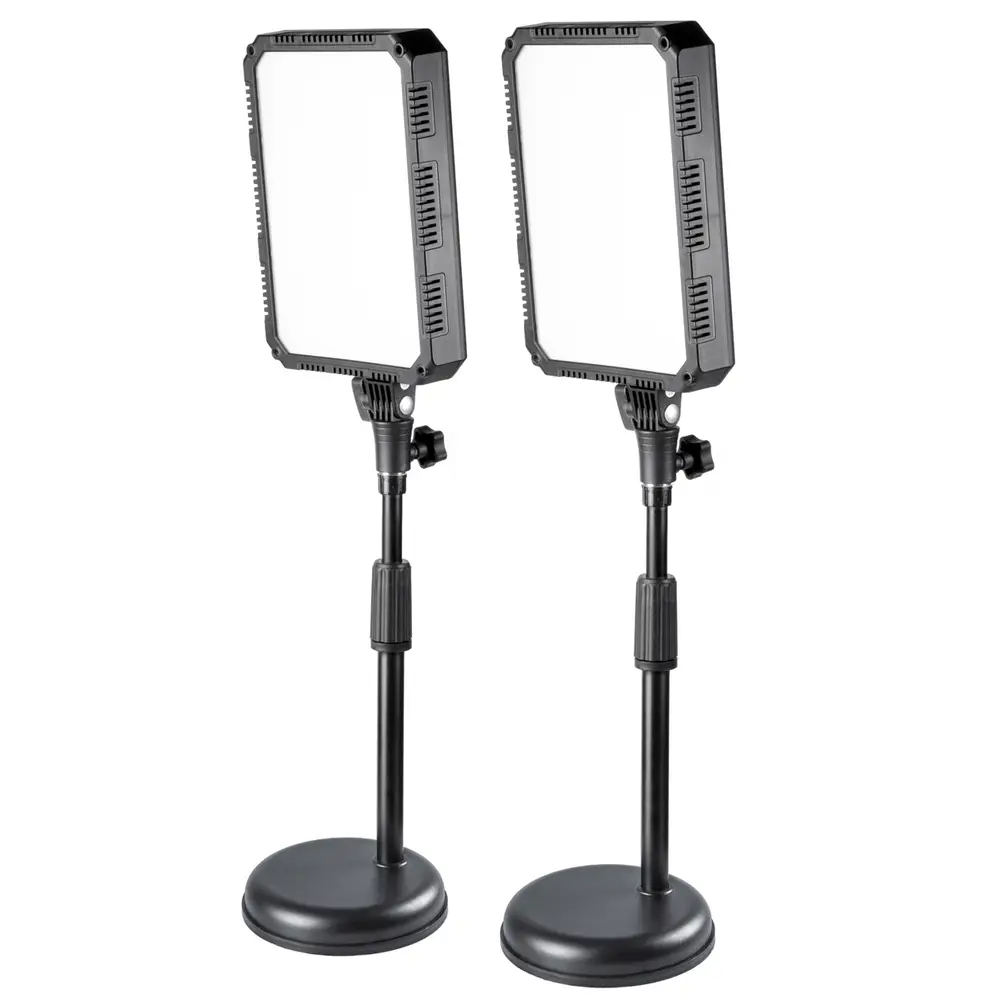 Mit zwei kompakten LED-Desktop-Leuchten PL 24Vario mit variabler Farbtemperatur. Für gleichmäßige und weiche Ausleuchtung bei Foto- und Videoaufnahmen. Besonders geeignet für Porträt, Interview, Social Media-Aktivitäten, Vlogging, Videokonferenzen, Webinare, Baby- und Kinderfotografie sowie Stilllife-, Tabletop- und Makroaufnahmen. Dimmbar. Netzbetrieb. Jeweils inkl. höhenverstellbarem Desktop-Stativ mit Rundsockel.
