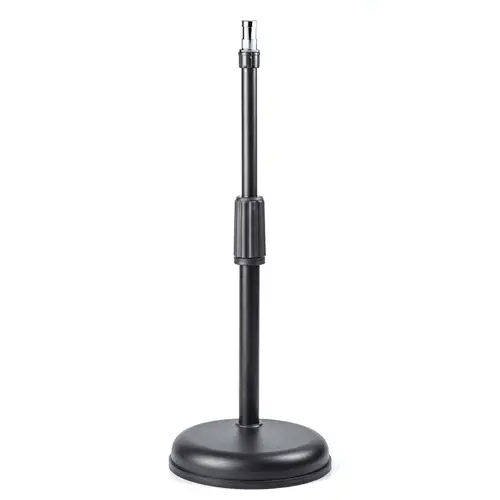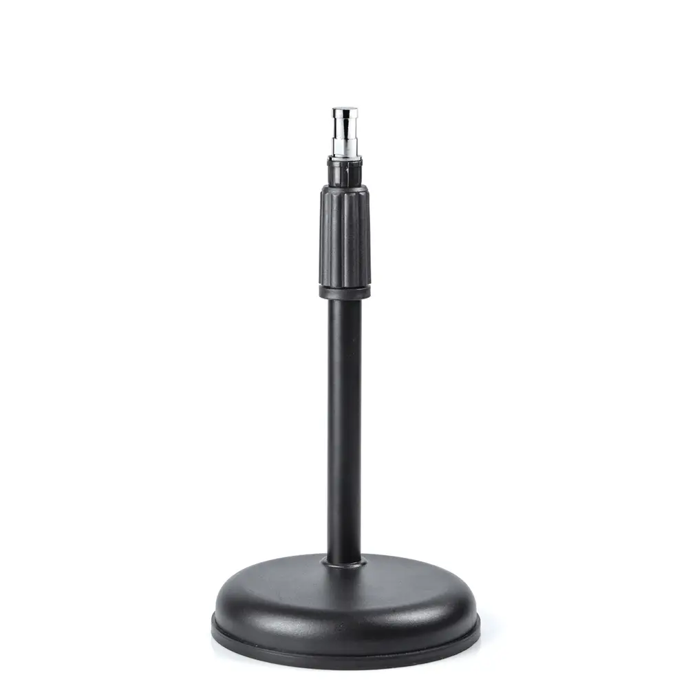 Desktop-Stativ in der Höhe um ca. 16,5 cm verstellbar. Rundsockel für stabilen Stand bei geringem Platzbedarf.