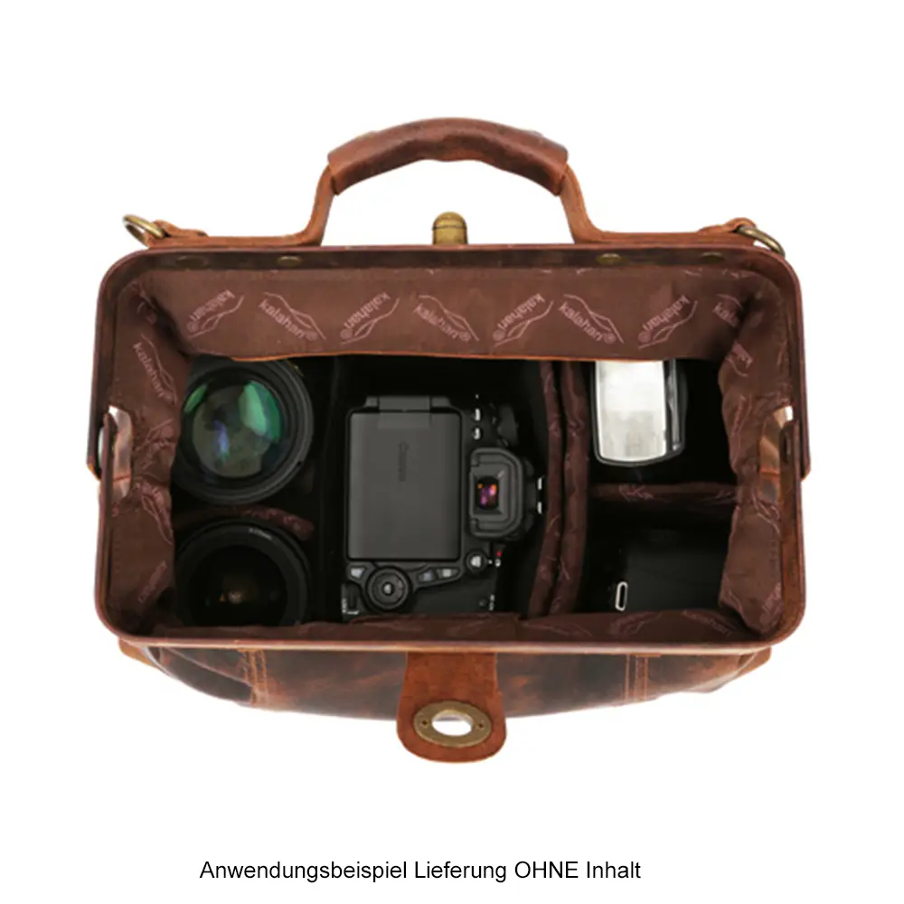 • Die stilvolle Fototasche im Look eines Doktorkoffers vereint nicht nur Ästhetik, sondern auch Funktionalität. Der breit öffnende Mechanismus, der von oben die gesamte Kameraausrüstung freigibt, ermöglicht einen bequemen Zugriff.• Die komplett entnehmbare Inneneinteilung bietet Flexibilität und Organisation. Das Rückfach mit Reißverschluss ist ideal für die Aufbewahrung von Zubehör wie Akkus und Speicherkarten.• Mit dem abnehmbaren Schultergurt und dem Tragegriff ist die Tasche auch für längere Ausflüge und Städtetouren bestens geeignet.