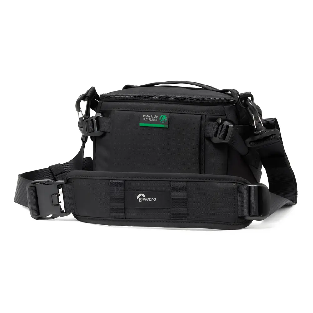 Die ProTactic Lite SLX 110 AW III wird mit einem verstellbaren Schultergurt geliefert, sodass sie sich als Schulter- oder Umhängetasche bequem tragen lässt. Der Gurt verfügt über eine Schnalle mit einer Sicherung gegen unbeabsichtigtes Lösen und elastische Schlaufen zum Sichern von überschüssiger Gurtlänge. Mit dem ProTactic III Zubehör-Gürtel oder dem Gürtel des ProTactic BP 350 III oder 450 III kann die Tasche auch als Hüfttasche getragen werden.