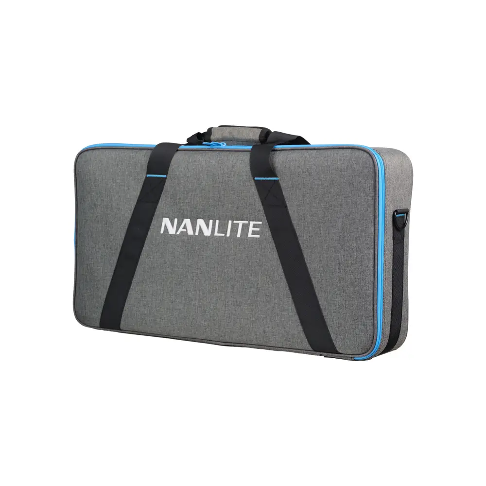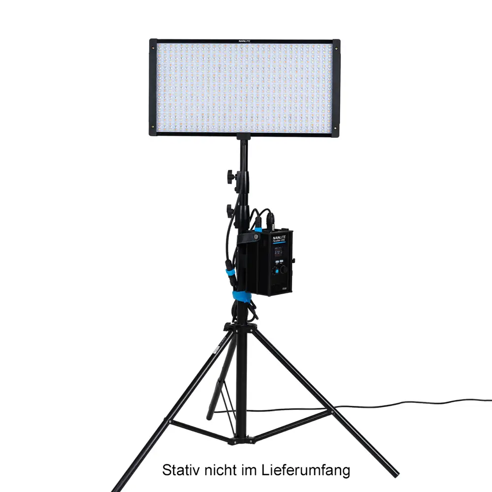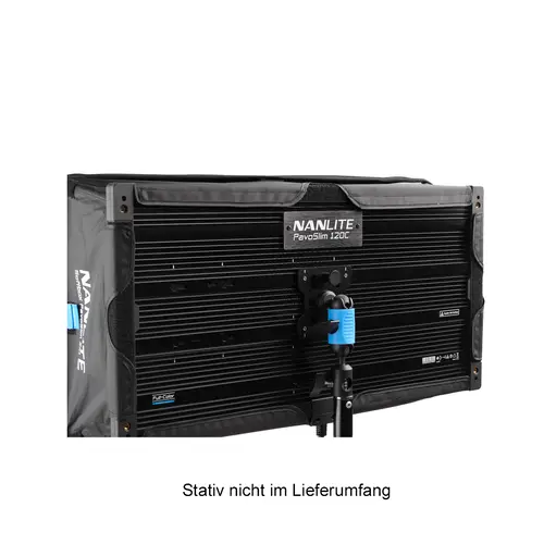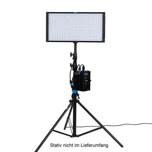 Lieferumfang: Flächenleuchte, separate Steuereinheit, Verbindungskabel (2,60 m), Netzkabel (4,50 m), Stativklammer, Softbox SB-PS-120Q, Leuchtenhalterungen und Transportkoffer.