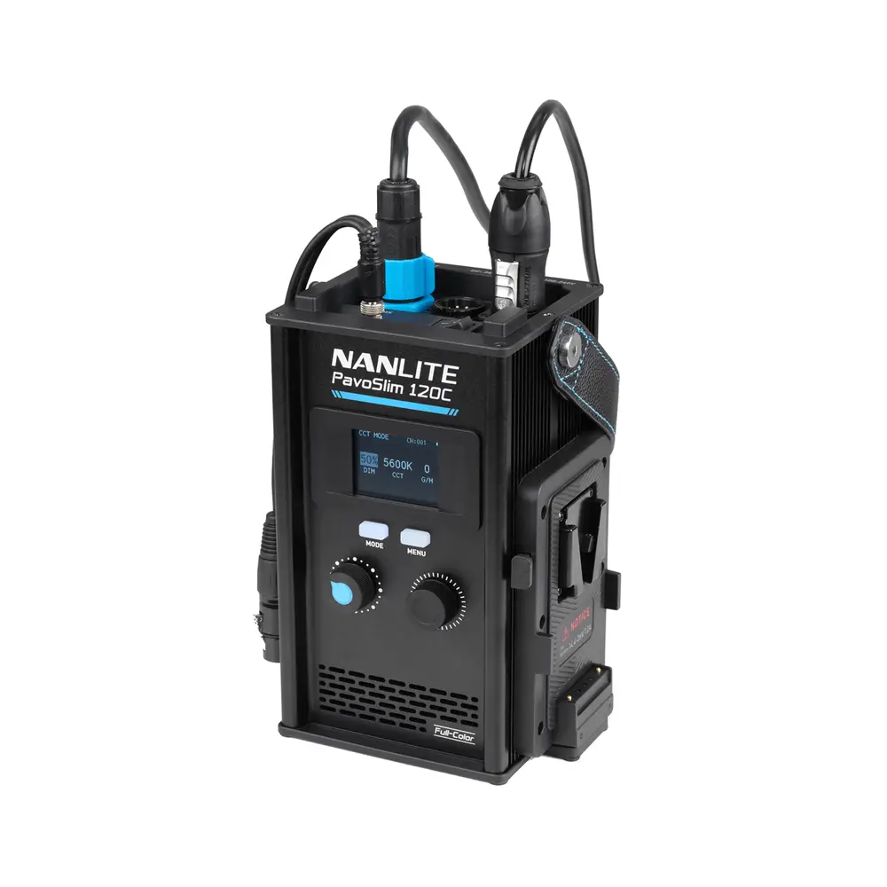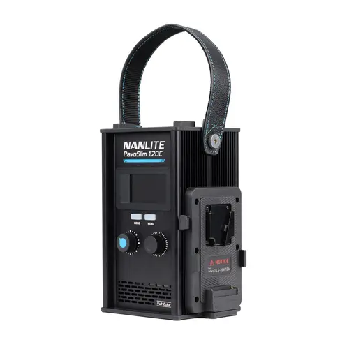 Separate Steuereinheit mit Bedienelementen und übersichtlichem 2,0“-Farb-Display sowie Anschlüssen für V-Mount-Akku, DMX/RDM-Adapterkabel, 24 V DC, usw. USB-Buchse für Firmware-Update. Tragegriff. Befestigung der Steuereinheit am Leuchtenstativ mittels mitgelieferter Stativklammer mit Schnellkupplung. 4,50 m-Netzkabel.
