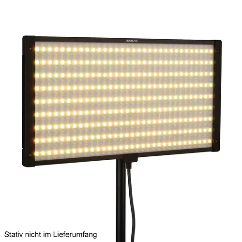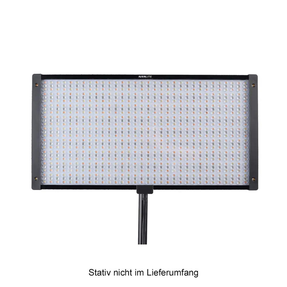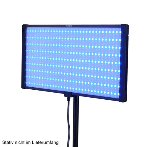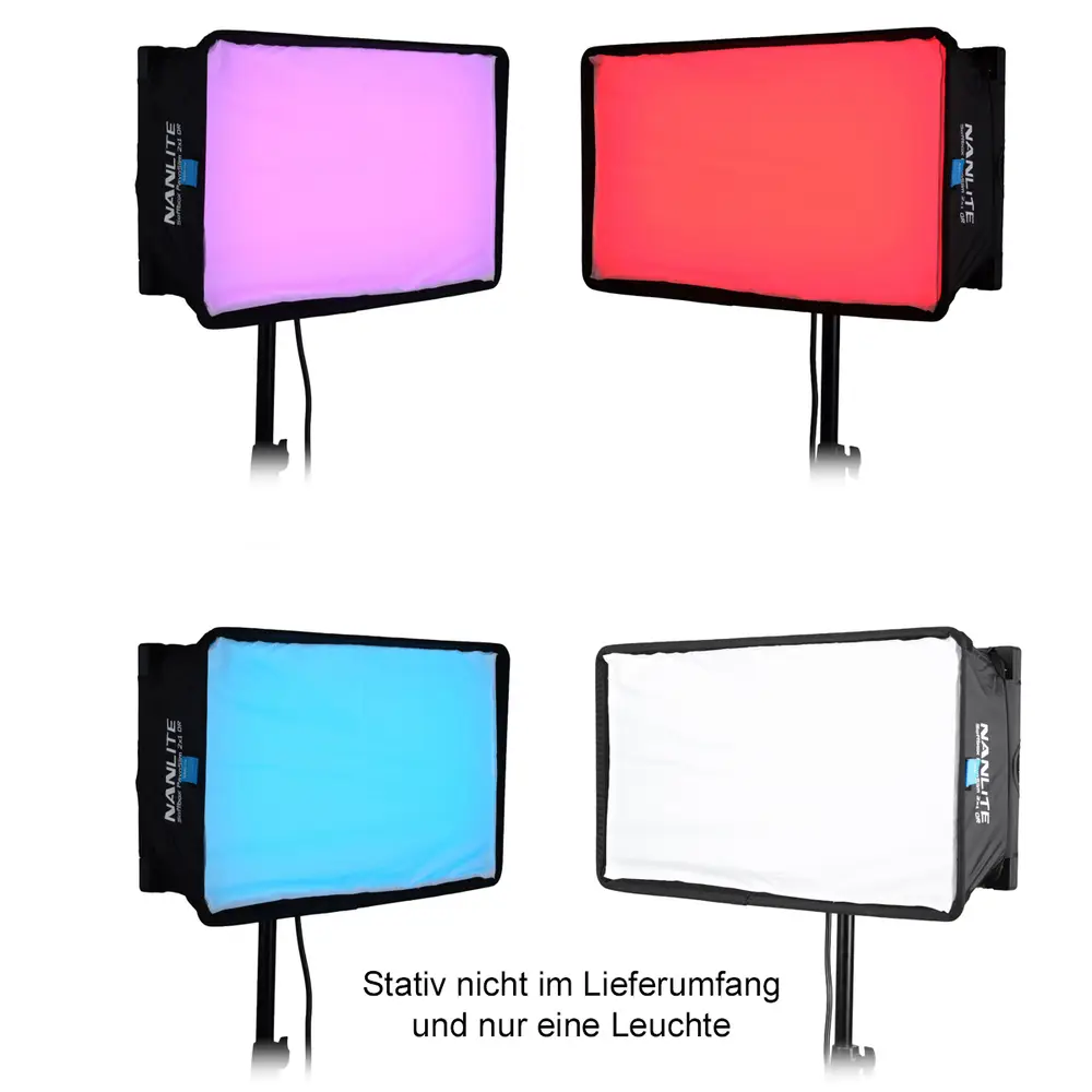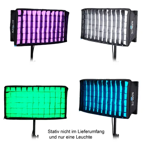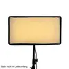 Professionelle, nur 1,86 cm flache Full-Color-Flächenleuchte mit weißem Licht (variable Farbtemperatur 2700 – 7500 Kelvin) und farbigem Licht sowie robustem, aber trotzdem leichtem Metallgehäuse 60 x 30 cm. Selbst mit montierter Softbox flacher als Leuchtmatten mit Halterahmen.