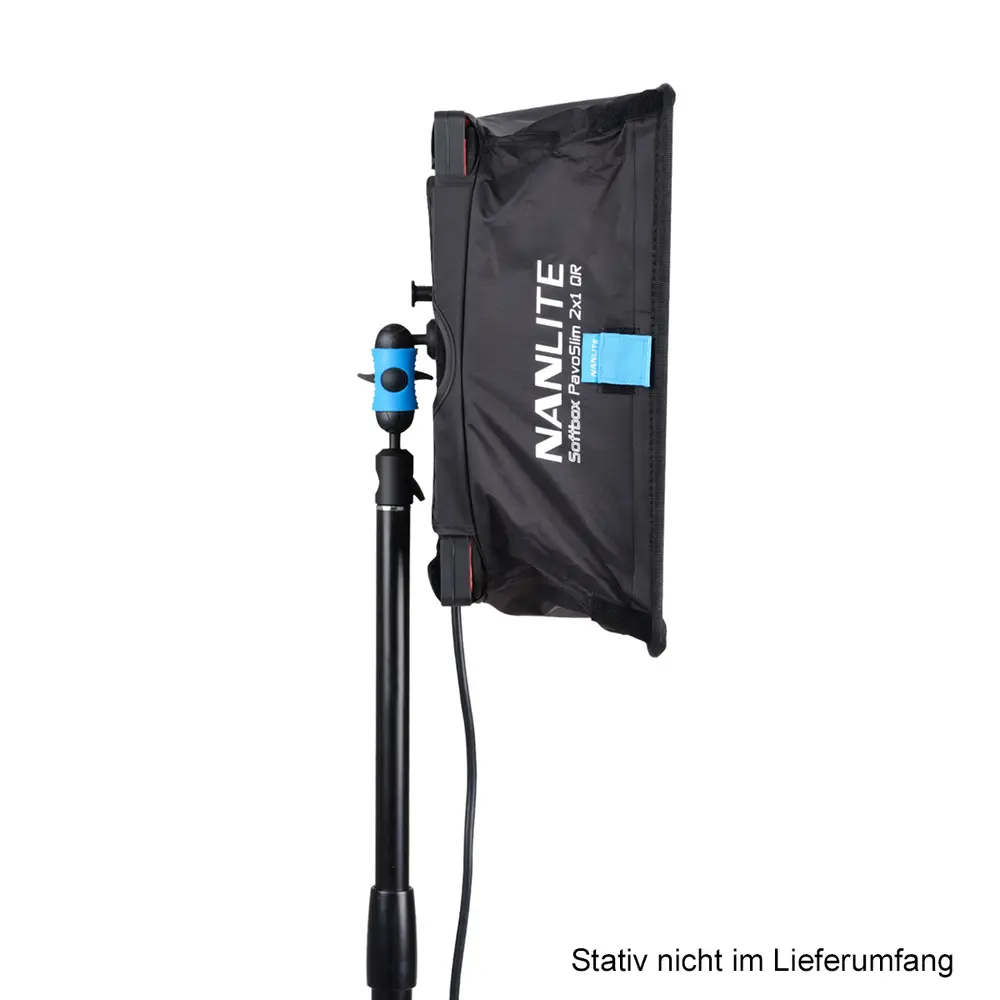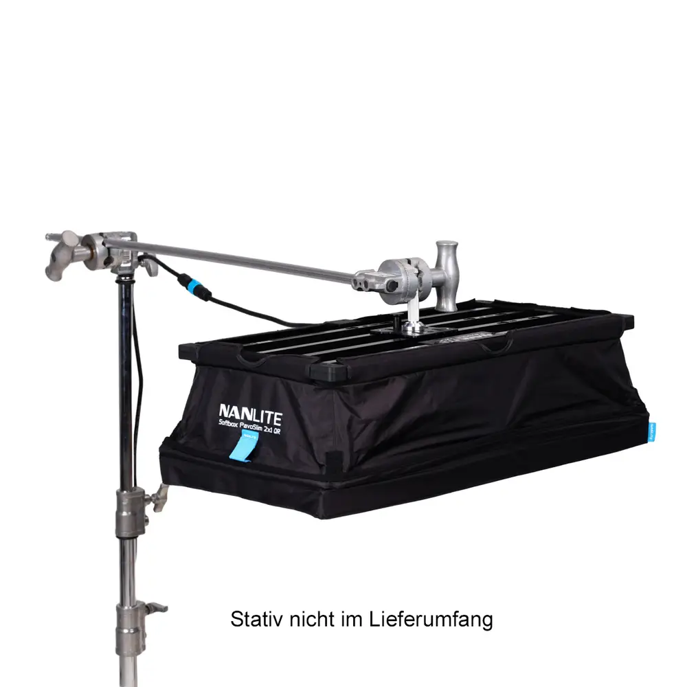 Patentierter Mechanismus zum schnellen Aufrichten der montierten Softbox und ebenso schnellem Zusammenfalten an den Außenseiten der Leuchte. So kann die Softbox auch bei Aufbewahrung der Leuchte im Transportkoffer montiert bleiben. Inkl. Standard- und Lite-Diffusor sowie abnehmbarer Stoffwabe.