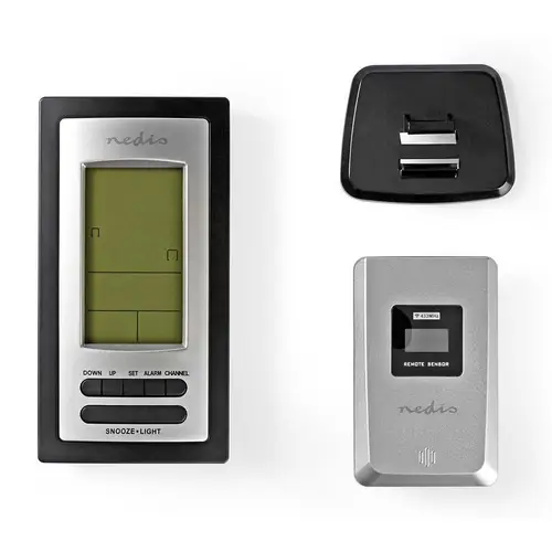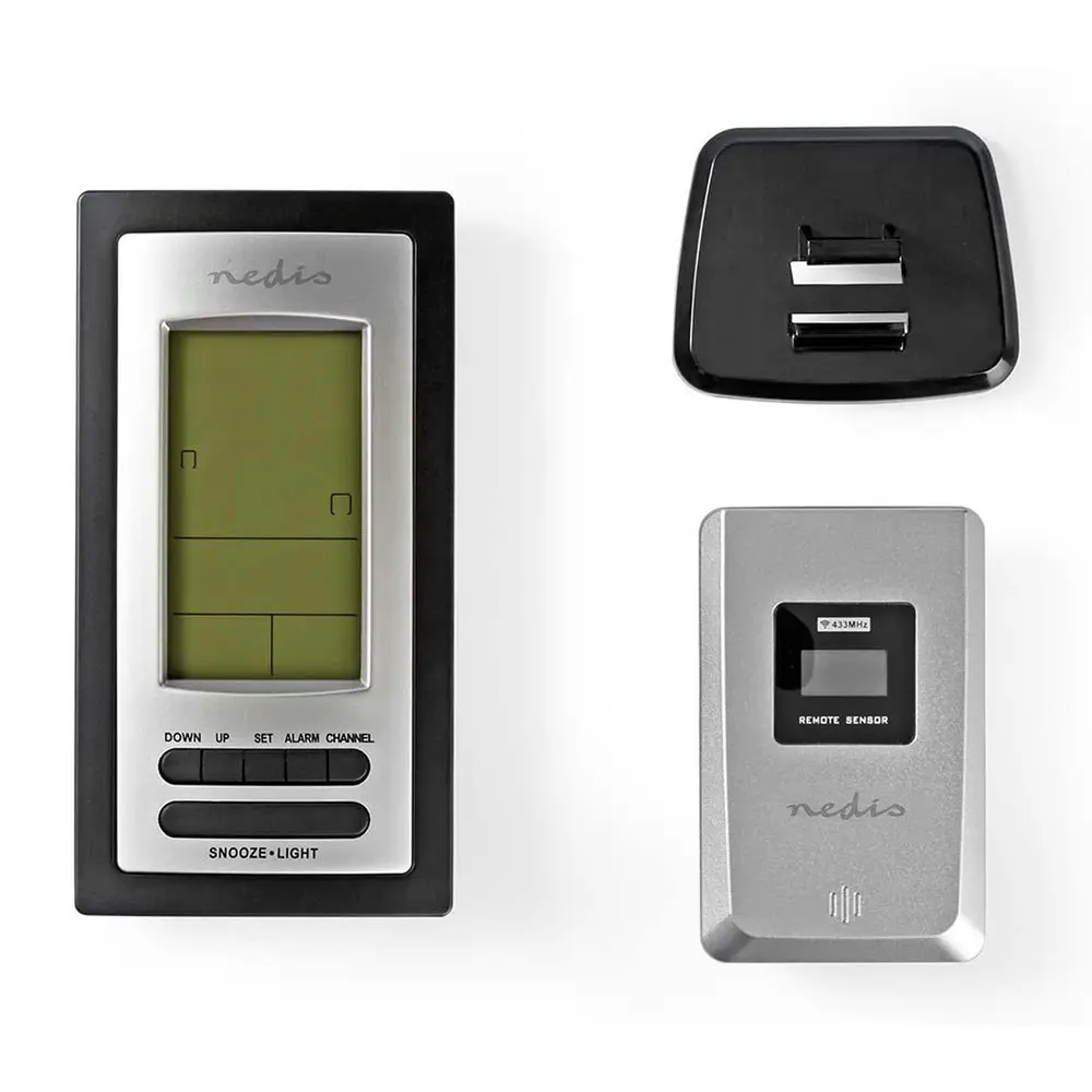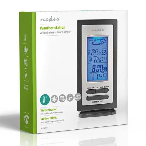Die Wetterstation ist mit einem externen Sensor und Sender ausgestattet und zeigt die Innen- und Außentemperatur an. Das integrierte Hygrometer dient zur Messung der Luftfeuchte im Raum. Darüber hinaus verfügt die Wetterstation über einen Kalender sowie eine Uhr mit Wecker- und Schlummerfunktion. Somit ist sie nicht nur für das Büro, sondern auch für zu Hause geeignet.Hauptmerkmale• Gebrauch: Wettervorhersage• Typ: Innen- und Aussenbereich• Materialien: Kunststoff• Sensorgröße: 60 x 95 x 25 mm• Feuchtigkeit: 20-90 %• Batterietyp: 3x AAA; 2x AAA (nicht im Lieferumfang)• Außentemperaturbereich: von -20 bis 60 °C• Innentemperaturbereich: von -20 bis 60 °C• Abmessungen: 164 x 80 x 62 mm