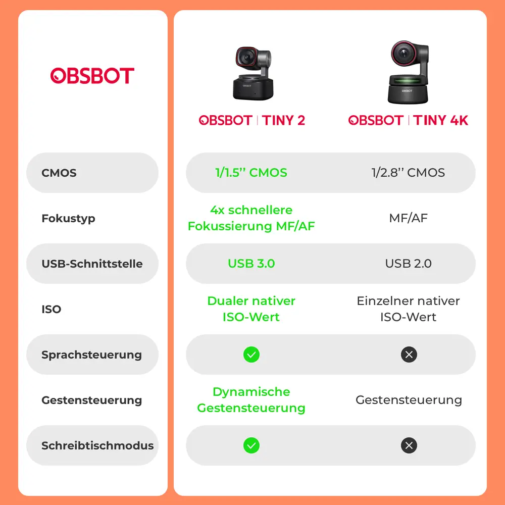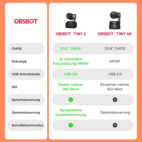 Ultra großer 1/1.5 CMOS-Sensor - Die OBSBOT Tiny 2 ist mit einem ultragroßen 1/1.5“ CMOS-Sensor ausgestattet, der die Videoqualität in der Webcam-Branche auf ein neues Niveau hebt.