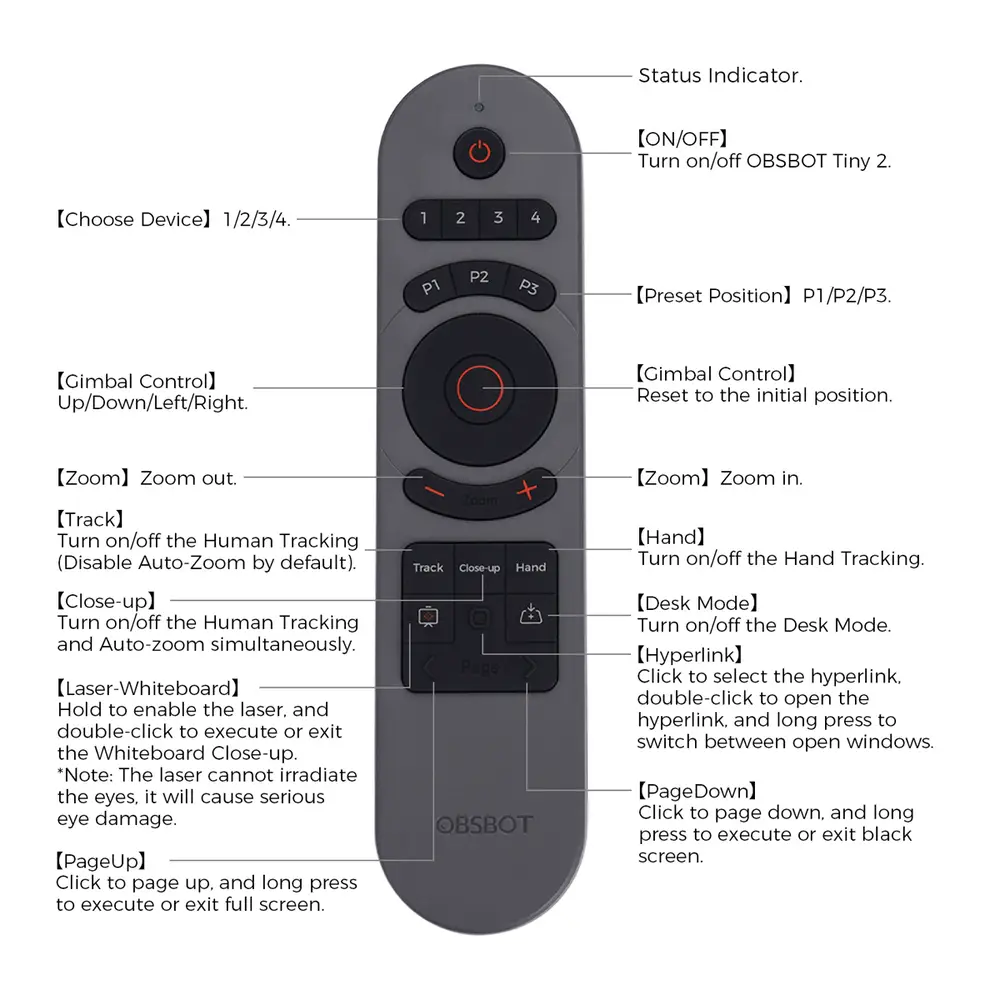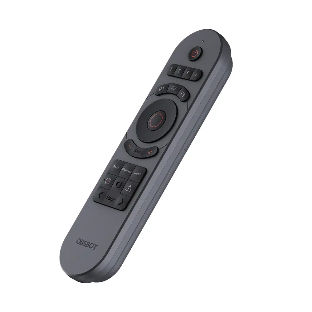 Produktmerkmale• elegantes Design• speziell für die OBSBOT Tiny-Serie entwickelt, mit intuitiven Tasten und elegantem Design bietet es Ihnen eine angenehmere und bequemere Nutzung.• aktivieren Sie KI-Funktionen mit einem Tastendruck• integrieren Sie mehr KI-Funktionen in die Fernbedienung. Jetzt können Sie den OBSBOT Tiny 2 ganz einfach steuern, um in den Nahaufnahme-Modus, den Desk-Modus und andere KI-Funktionen zu wechseln.• Kombination aus Fernbedienung und Präsentationsklicker• Nicht nur zur Fernsteuerung des OBSBOT Tiny 2. Wir haben die Funktion eines Präsentationsklickers mit der Fernbedienung kombiniert, sodass Sie jetzt die Fernbedienung verwenden können, um Ihre Idee besser zu präsentieren.