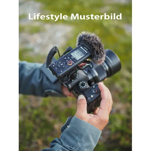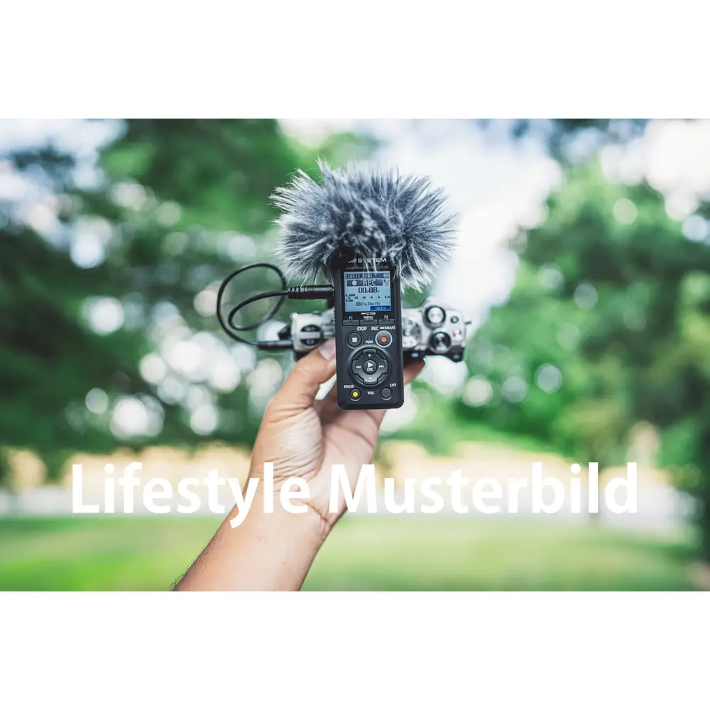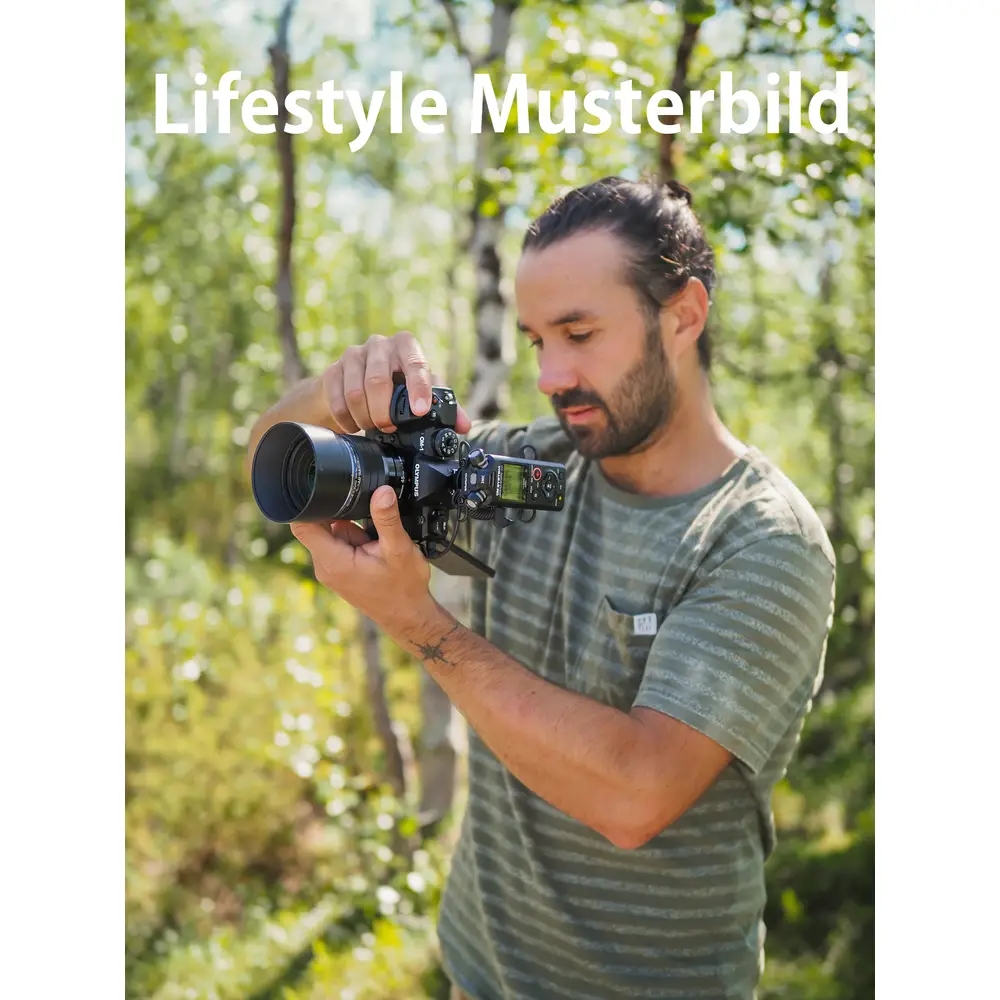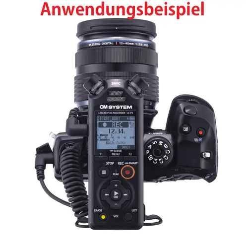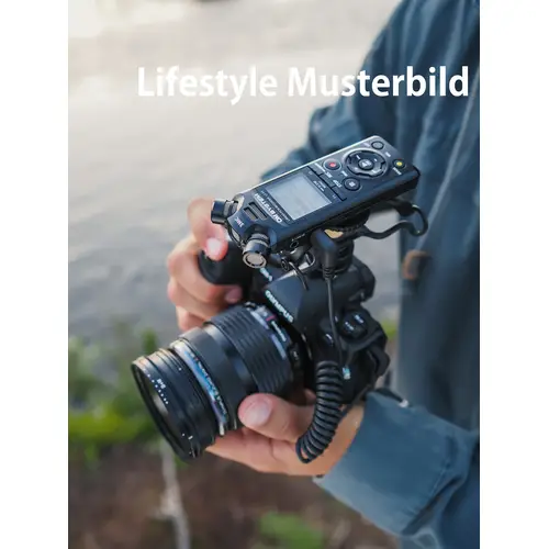 Der LS-P5 kann durch optionales Zubehör mit anderen Produkten kombiniert werden. Mit dem 3,5-mm- Audiokabel KA-335 (optional erhältlich) kann der Recorder beispielsweise an eine spiegellose Kamera von OM SYSTEM, die über eine entsprechende Eingangsbuchse verfügt, angeschlossen und als externes Mikrofon verwendet werden. Um Kamerabetriebsgeräusche und Vibrationsgeräusche zu dämpfen und eine noch bessere Audioqualität zu erzielen, kann der SM2 Shock Mount Adapter (optional erhältlich) zwischen dem Blitzschuh der Kamera und dem Stativanschluss des LS-P5 angebracht werden. Für Aufnahmen im Freien empfiehlt sich der Windschutz, der Windgeräusche minimiert. Der LS-P5 kann nicht nur zum Aufzeichnen des Tons an der Kamera genutzt werden, sondern auch für qualitativ hochwertige Original-Soundaufnahmen in PCM, die dann später bei der Bearbeitung am Computer in das Video integriert werden können. Klappenton und Testton werden ebenfalls unterstützt, was bei der Einbindung von Audiodaten in Videos für eine hochwertige Videoproduktion äußerst hilfreich ist.
