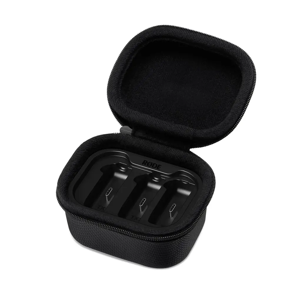 Produktmerkmale:• robustes Reißverschluss-Case mit genarbtem Kunstlederbezug• Slots für zwei Sender (TX) und einen Empfänger (RX)• zum Laden der drei Wireless GO (Gen 3) Module• erlaubt auch Datenübertragung vom und zum Rechner• Akkukapazität: 4.200 mAh, reicht für 2x Aufladen aller Module• USB-C Port, Strombedarf: 5 V/3 A• Ladezeit: ca. 2 Stunden• Ladestatus-LED mit Prüftaster auf der Rückseite