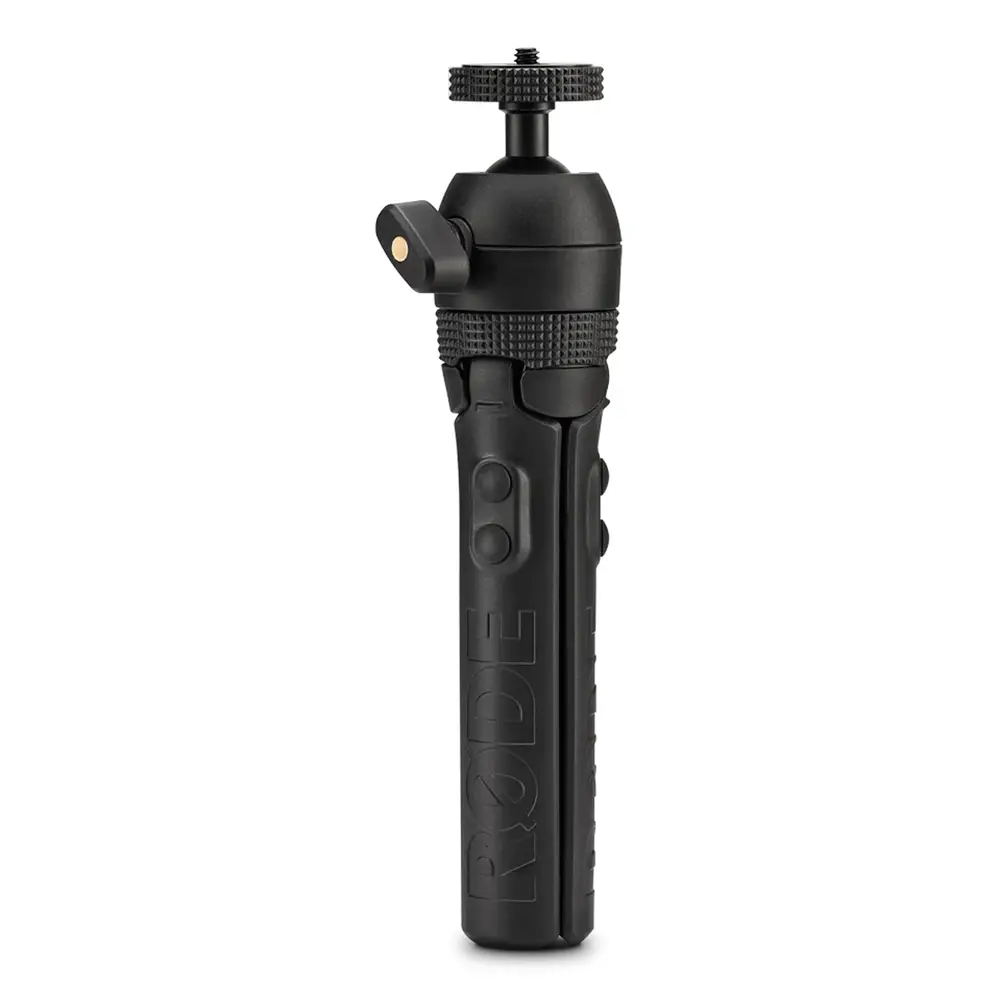 Der Kugelkopf des Miniatur-Dreibeinstativs hat eine 1/4" Gewindeschraube für Kameras; ein Adapter auf 3/8“ für Mikrofone liegt bei. Klappt man die Füße zusammen, lässt sich der Tripod 2 auch als Hand- bzw. Pistolengriff nutzen.