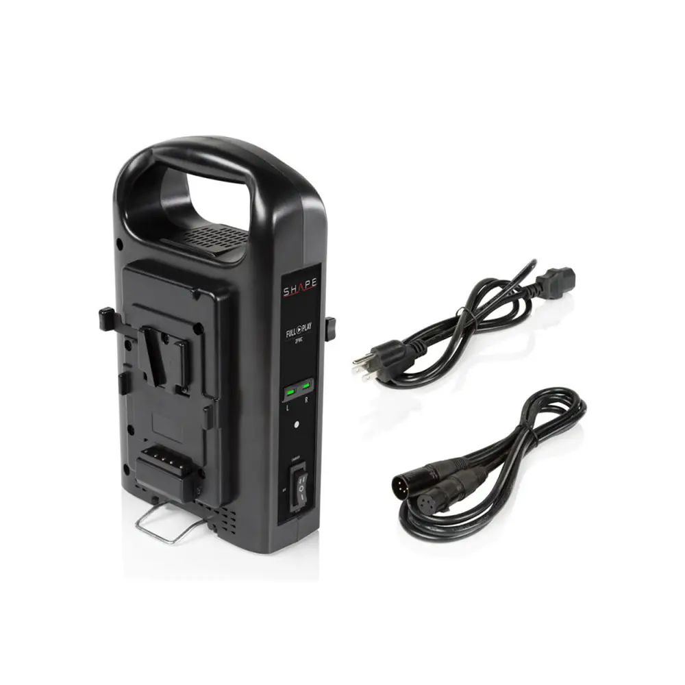 Hauptmerkmale:• V-Mount• Akkuladung wird durch LEDs angezeigt• 4-Pin XLR Wechselstrom Output• 16,8V, 3,0A Ladegerät Output• Schalter mit drei Einstellungen: Aufladen, Gleichstrom Out, Aus• Beinhaltet ein 4-Pin XLR Male-Female Kabel, um anderes Zubehör mit Strom zu versorgen• Stromeingang: 90-242V, 47-63Hz, 3,8A Gleichstrom• Produkt Dimensionen: 24,5cm x 15cm x 8,5cm, Gewicht: 1kg• Ein Stromkabel und ein 4-Pin XLR Kabel im Lieferumfang