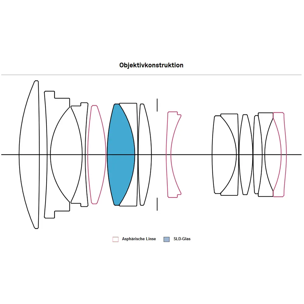 Basierend auf der neuesten optischen Designtechnologie enthält das Objektiv 14 Elemente in 11 Gruppen, davon 3 asphärischen Linsen und 1 SLD-Glaselement. Dieses optische Design eliminiert effektiv verschiedene Aberrationen, wie Astigmatismus und Feldkrümmung, die durch die Kamera nicht korrigiert werden können.