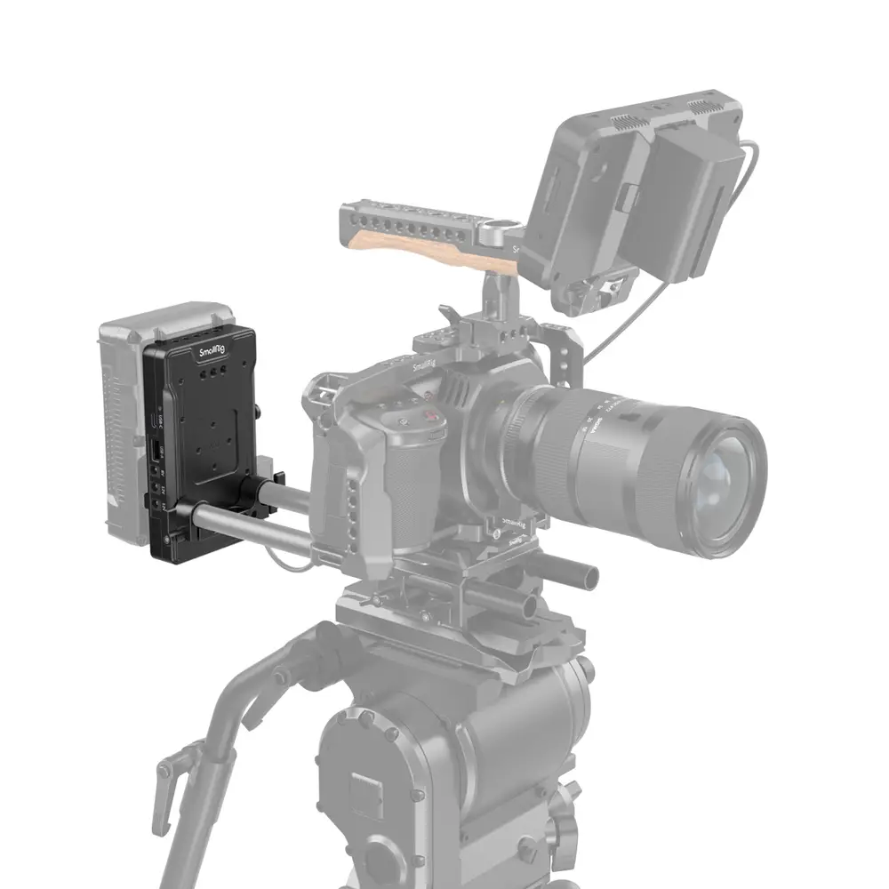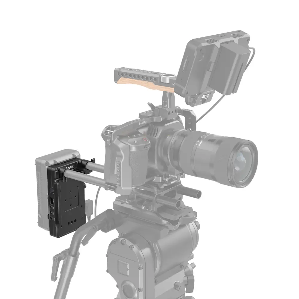 Dieser Artikel verfügt über einen Standard-V-Mount, kompatibel mit den meisten V-Mount-Batterien auf dem Markt, sechs 1/4"-20-Gewindebohrungen und zehn M4-Gewindebohrungen auf der Rückseite, fünf 1/4"-20-Gewindebohrungen auf der Ober- und Unterseite, die Dual-Stabklemme und viele andere Accessoires unterstützen.