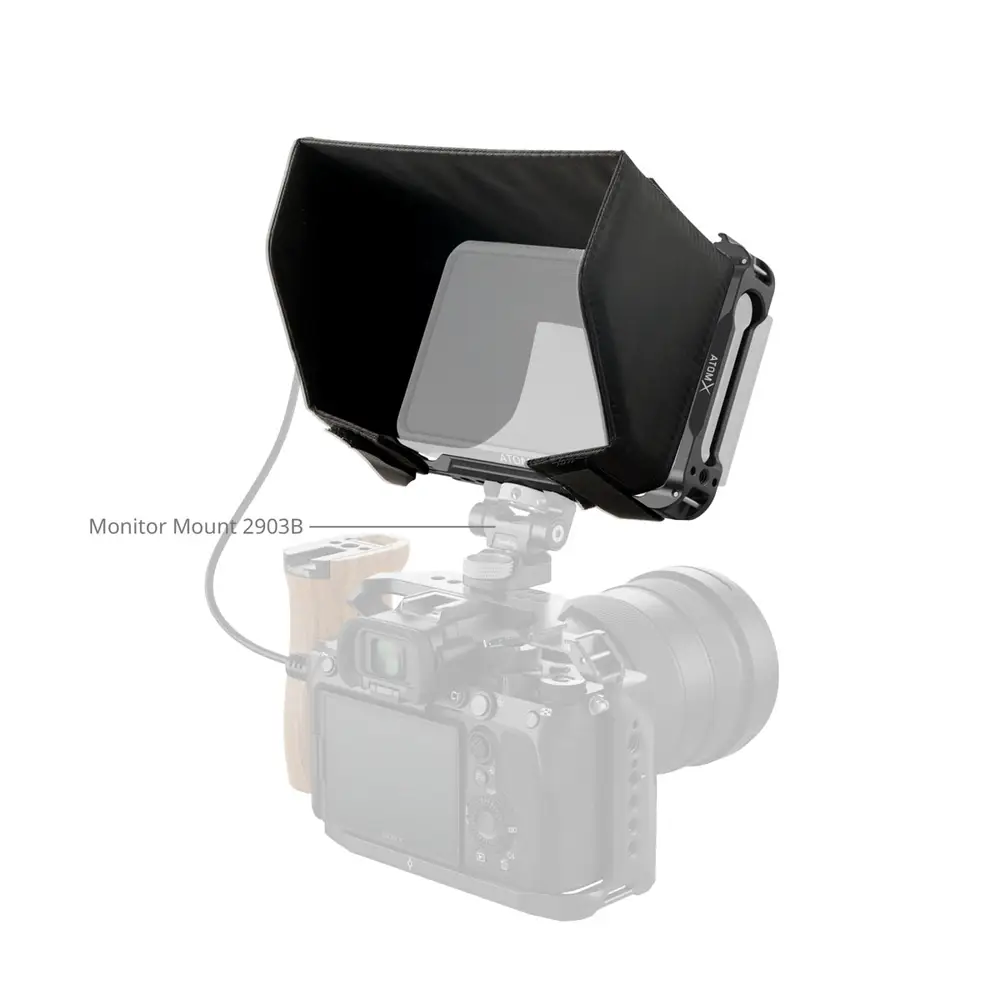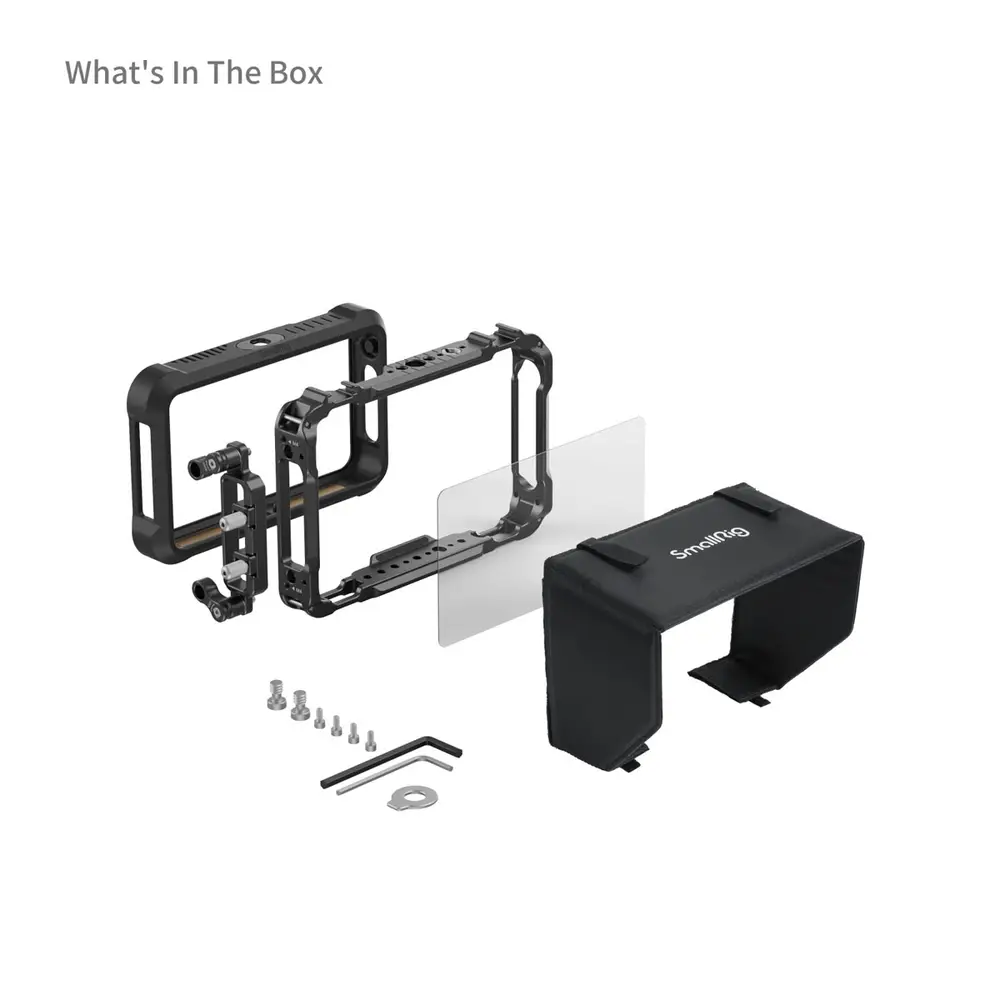 Das Kit umfasst den Käfig, eine Sonnenblende sowie eine Silikon-Schutzhülle und die Displayschutzfolie. Der Käfig ist mit einem Slider ausgestattet, der für den Magic Arm (SmallRig 2071B) und die Monitorhalterung (SmallRig BSE2385) genutzt werden kann. Zudem gibt es 1/4"-20-Gewindebohrungen, welche die Befestigung der Monitorhalterung (SmallRig 2903B) und Schwenkarme (SmallRig 2070D) ermöglichen. Die ARRI 3/8"-16-Aufnahmelöcher unterstützen die Anbringung der Schwenkarme (SmallRIg 2115C). Das Set beinhaltet auch eine professionelle HDMI-Kabelklemme, die dafür sorgt, dass die Schnittstelle geschützt wird und Verbindungsabbrüche vermieden werden. Neben dem Käfig enthält das Kit auch eine Sonnenblende, die starkes Sonnenlicht effektiv abhält. Eine Silikonhülle, die mit Messing eingebettet ist, unterstützt die Wärmeableitung und bietet zusätzlichen Schutz. Zudem gibt es eine Displayschutzfolie, die sich leicht anbringen lässt und den Bildschirm vor Fingerabdrücken, Spritzwasser, Staub, Kratzern und Stößen schützt.