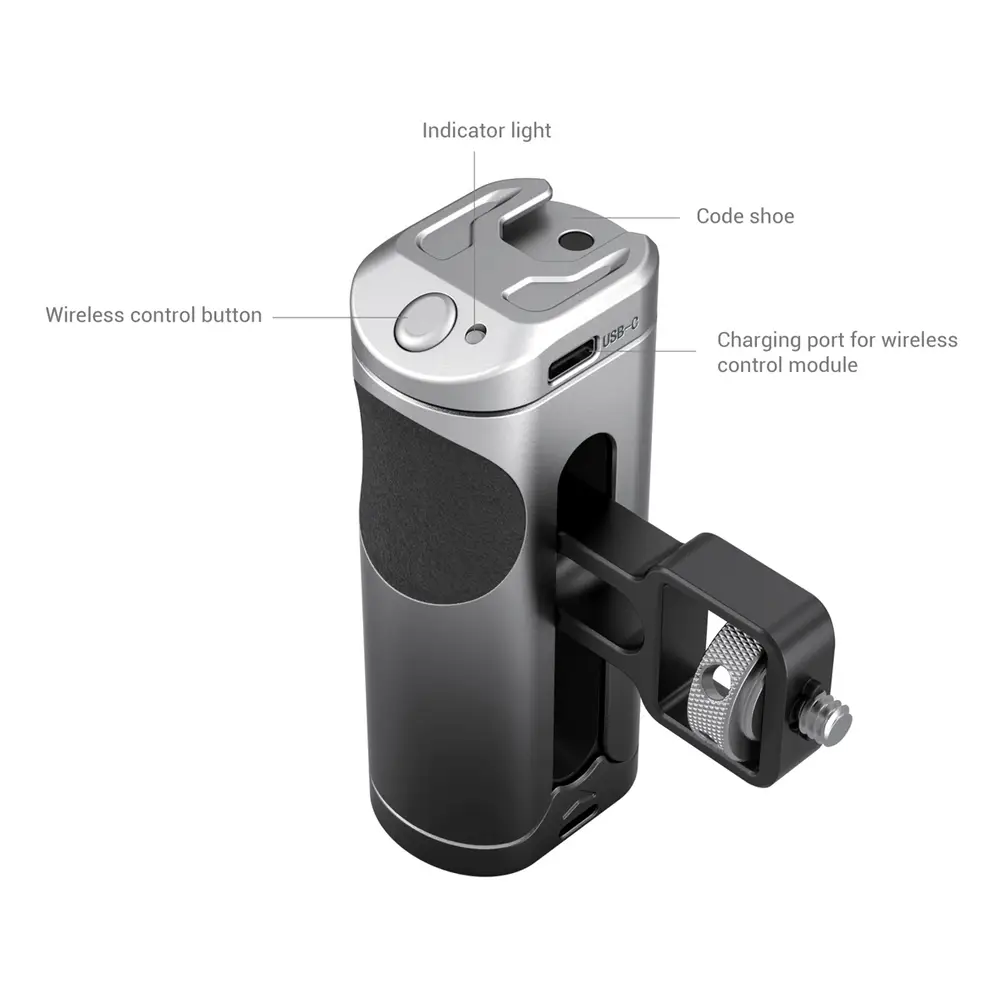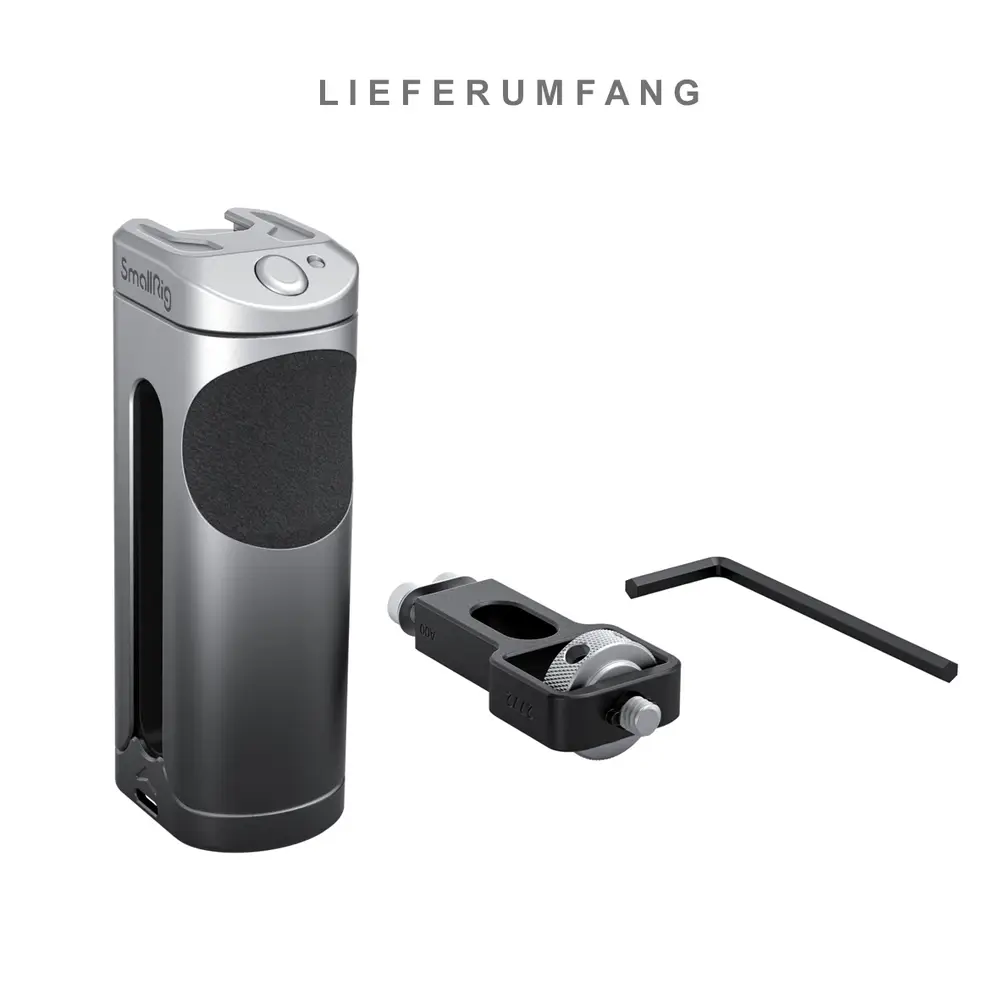 An der Oberseite des Handgriffs befindet sich ein Cold-Shoe-Anschluss, an dem ein Mikrofon oder eine LED-Leuchte für professionellere Aufnahmen angebracht werden kann. Der Griff kann für die linke oder rechte Hand verwendet werden, indem der Griffanschluss angepasst wird. Außerdem kann er je nach Schwerpunkt und Position des Zubehörs nach oben und unten verschoben werden, um eine bessere Griffigkeit zu erreichen.