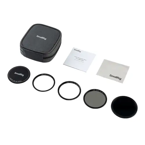 Das SmallRig 5-in-1-Aufsteckfilter-Kit VND 2-32 & CPL & 1/4 Effect Black Mist (67mm) 4726 enthält die wichtigsten VND-, CPL- und Black Mist-Filter, die häufig bei Videoaufnahmen verwendet werden, sowie Adapterringe mit Gewinde, einen magnetischen Objektivschutz und eine Aufbewahrungstasche.