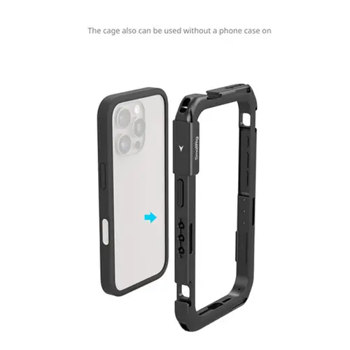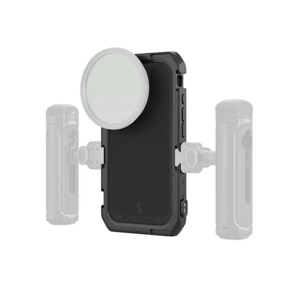 Die mit einer T-Mount-Schnellwechselplatte ausgestattete Handytasche dient als täglicher Schutz. Die T-Mount-Rückplatte kann durch einen Zierring, eine Objektivrückplatte mit 17-mm-Gewinde oder einen magnetischen 67-mm-Filteradapter für eine verbesserte optische Leistung ersetzt werden. Das Telefon kann schnell in den Käfig montiert werden, der mit mehreren 1/4"-20-Gewindebohrungen und Kaltlichthalterungen ausgestattet ist, um ihn mit Zubehör wie Griffen, Stativen, Mikrofonen und Lampen zu erweitern und so das Aufnahmeerlebnis zu verbessern, während die integrierten Schnellwechselschnittstellen eine nahtlose Verbindung gewährleisten.