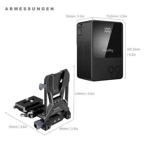 • Drehbares Design: Die V-Mount-Platte ist mit einer Drehfunktion für den schnellen Zugriff auf den seitlichen Klappbildschirm ausgestattet, was die Benutzerfreundlichkeit und den Komfort während Ihrer Aufnahmen verbessert.