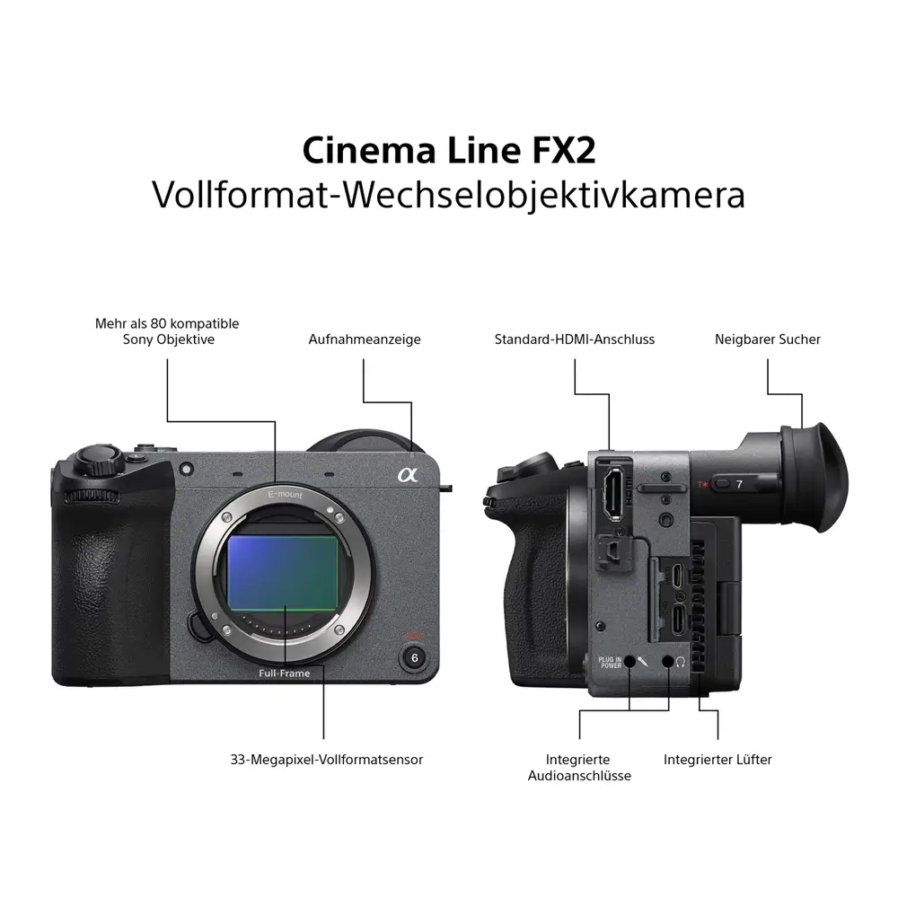 • Die Sony FX2 bietet einen 33-MP-Vollformatsensor für atemberaubende 4K-Videos mit bis zu 60 Bildern pro Sekunde, erweiterter Farbraum mit 4:2:2 10-Bit Codecs und einem Dynamikumfang von über 15 Blendenstufen.